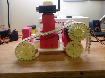 John, it's an EZ Robot based bot where the main logic board is controlled by a host program via bluetooth. I have some pink ABS, but after I printed the first 106 tread links in and then discovered that I needed to scale the z height on them a bit I ended up printing them in white which is what I ...
