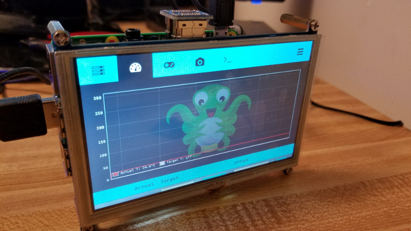 Once the Pi is done booting, you will need to bring it up in a browser. The OctoPrint interface should pop up a window asking you to specify a username and password for access control. Either set that up, or tell it to skip that. Please note that if you set up access control, it will apply to the touchscreen along with any other Web client, meaning that it will be read-only unless you log in through the touch screen.