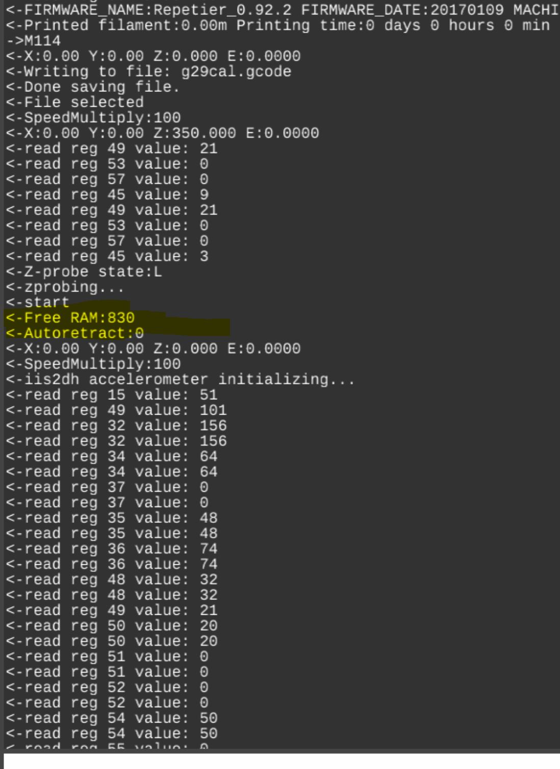 Here is what I get when sending the g29. The first auto-leveling enabled was me setting the value to 1 manually in the eeprom settings. It seams to turn off during the probe which I suppose makes sense. For the effector no, when it contacts the bed if just tried to keep going. And yes, I did clear it after every change.bruceg wrote:Did you clear your EEPROM before uploading the different Repetier configuration?