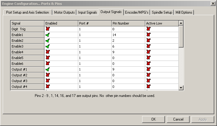 You do have your enable pin settings on the Output tab set properly though. Can you post a screenshot of the general configuration screen. If this configuration is verified and does not work, then you may have a bad parallel port or bad cable.