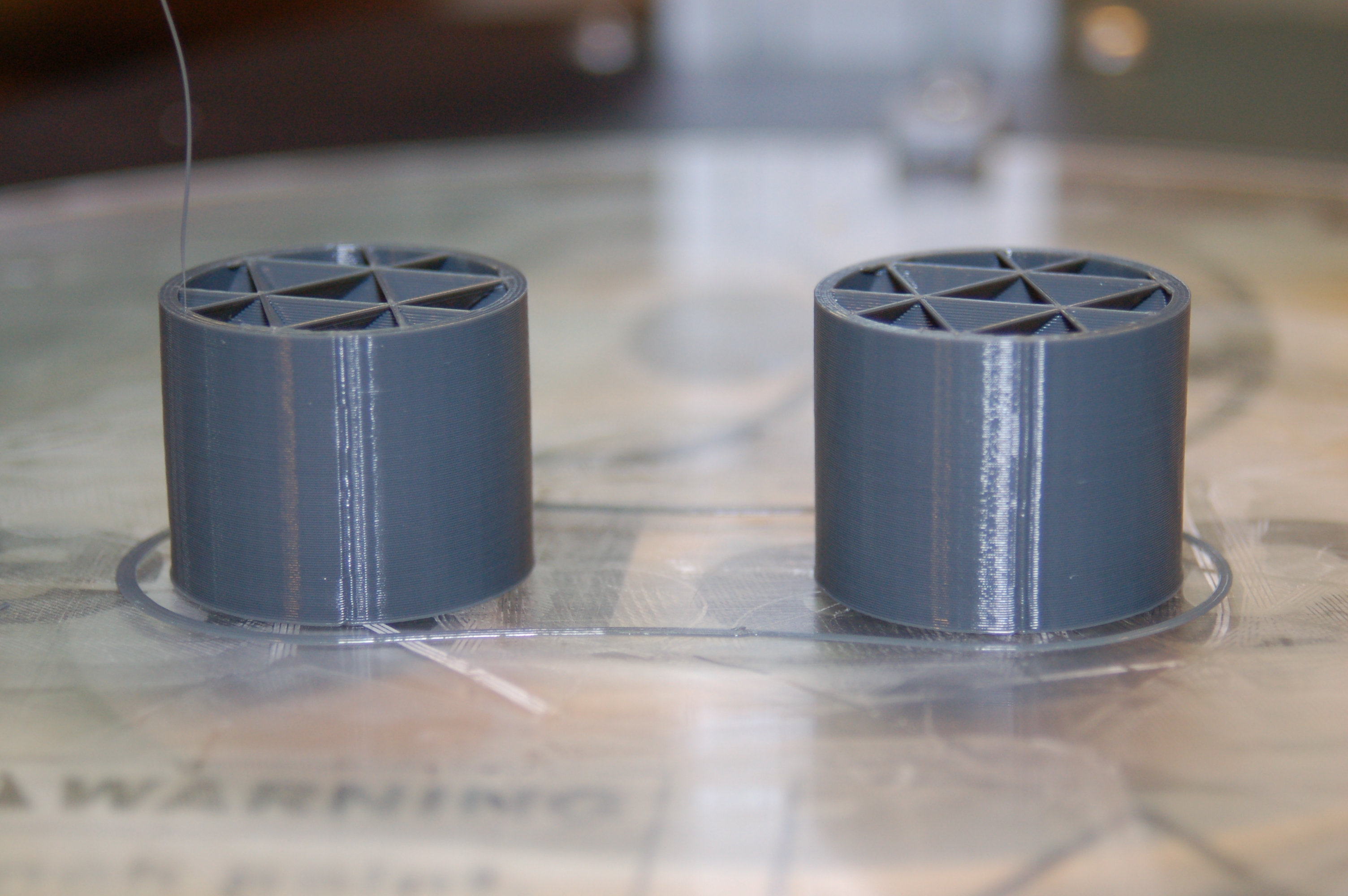 When I ran the test I was using Atomic Gunmetal Gray, which is my go-to material of late. That part prints /very/ quickly - there's no time for the previous layer to cool down and that's contributing quite a bit to the stringing issue. You can't print tiny things like that fast - there's just no time for the part layer to cool enough before the next layer is put down. I'm printing what I use for retract calibration - a pair of 25mm cylinders about 25-30mm apart. I'm printing this using the SE300 PLA Default profile from github @ 195C. When it's done, I'll take a photo of it and post the gcode here.
