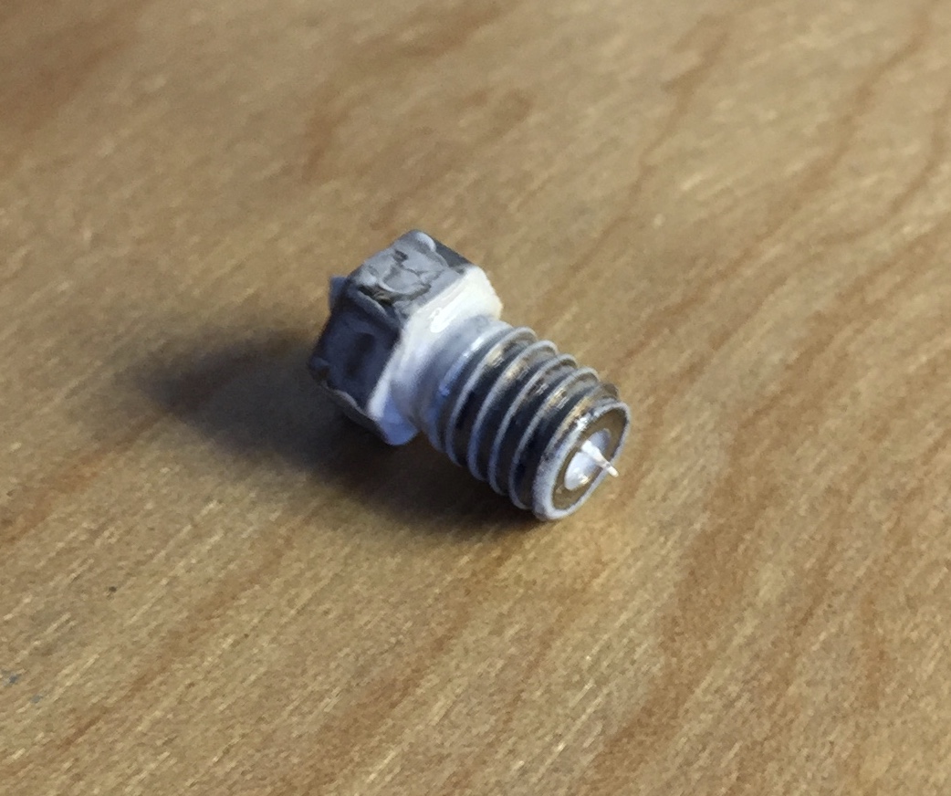 After recalibrating for the filament diameter and running a test print, noted that there was melted filament oozing out of the heater block above the nozzle. Shut everything down, disassembled the hot end again, and replaced the no-stick stainless nozzle with a stock 0.4mm brass nozzle.