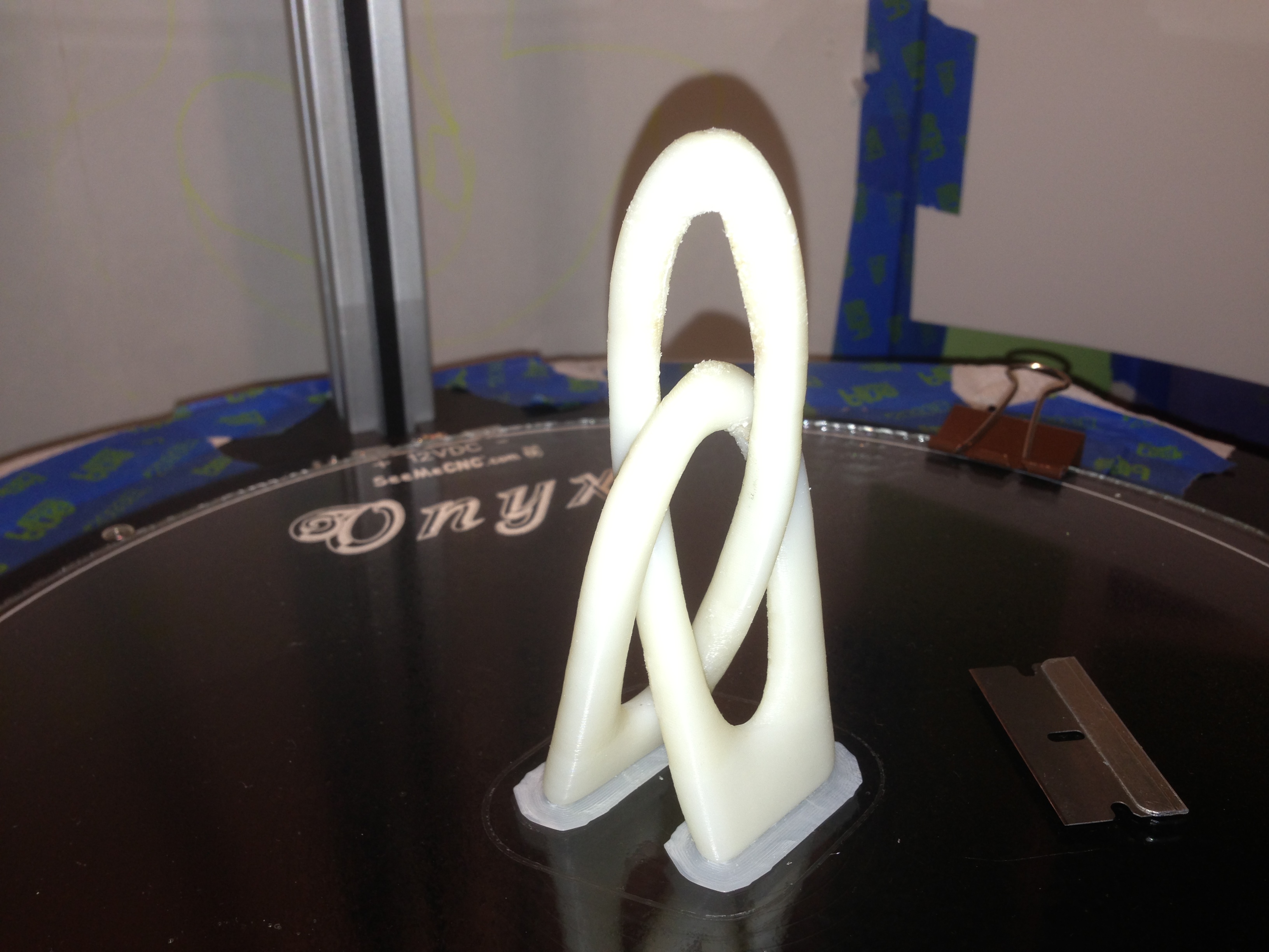 This sculpture can be found on Thingiverse under Vica Sculpture. It's such a nice print I had to post it here. Sliced with Slic3r at .20 Layer height, .25 first layer, .10 % infill, 45% speed, Skirt 2 loops 8mm from object 20mm skirt height, 5mm brim, no support, 2 raft layers for adhesion, Filament at 1.80mm diameter, 230 C Bed at 110 C, .40 nozzle diameter, Retraction at 5mm, lift z 1.5, retract speed 35%, min travel 2.5. ABS plastic filament.