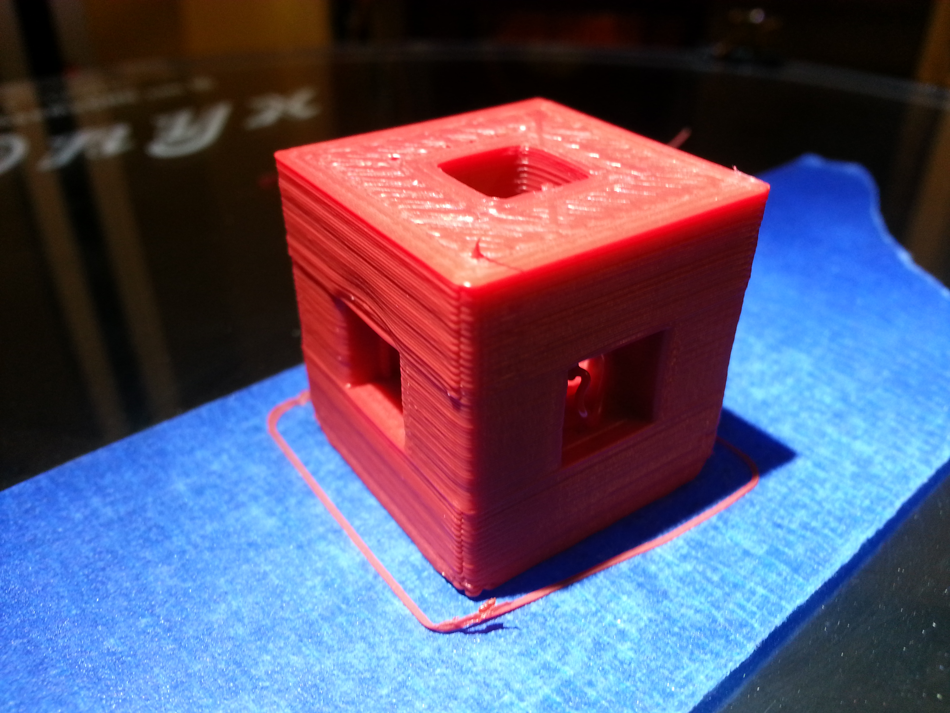 I'm still a long ways from getting really great prints off of it but things are looking promising. The only real snag I ran into was getting my abs plastic to stick to my glass build plate. I tried several different kinds of hair spray, and then tried blue tape, I eventually got one print to kinda sorta stick so I let it finish printing. I will need to investigate this further, and find a more reliable method.