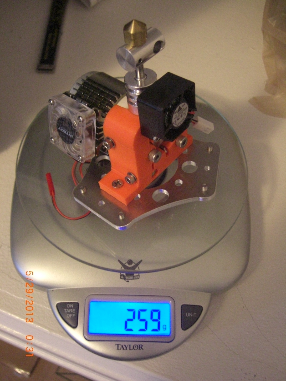 compared to the weight of stock stepper of 332grams. this weighs about 226grams, around 240grams with the magnet ball joints installed. not to much lighter but with all the fans/heatsinks installed it should still be under 300 grams.