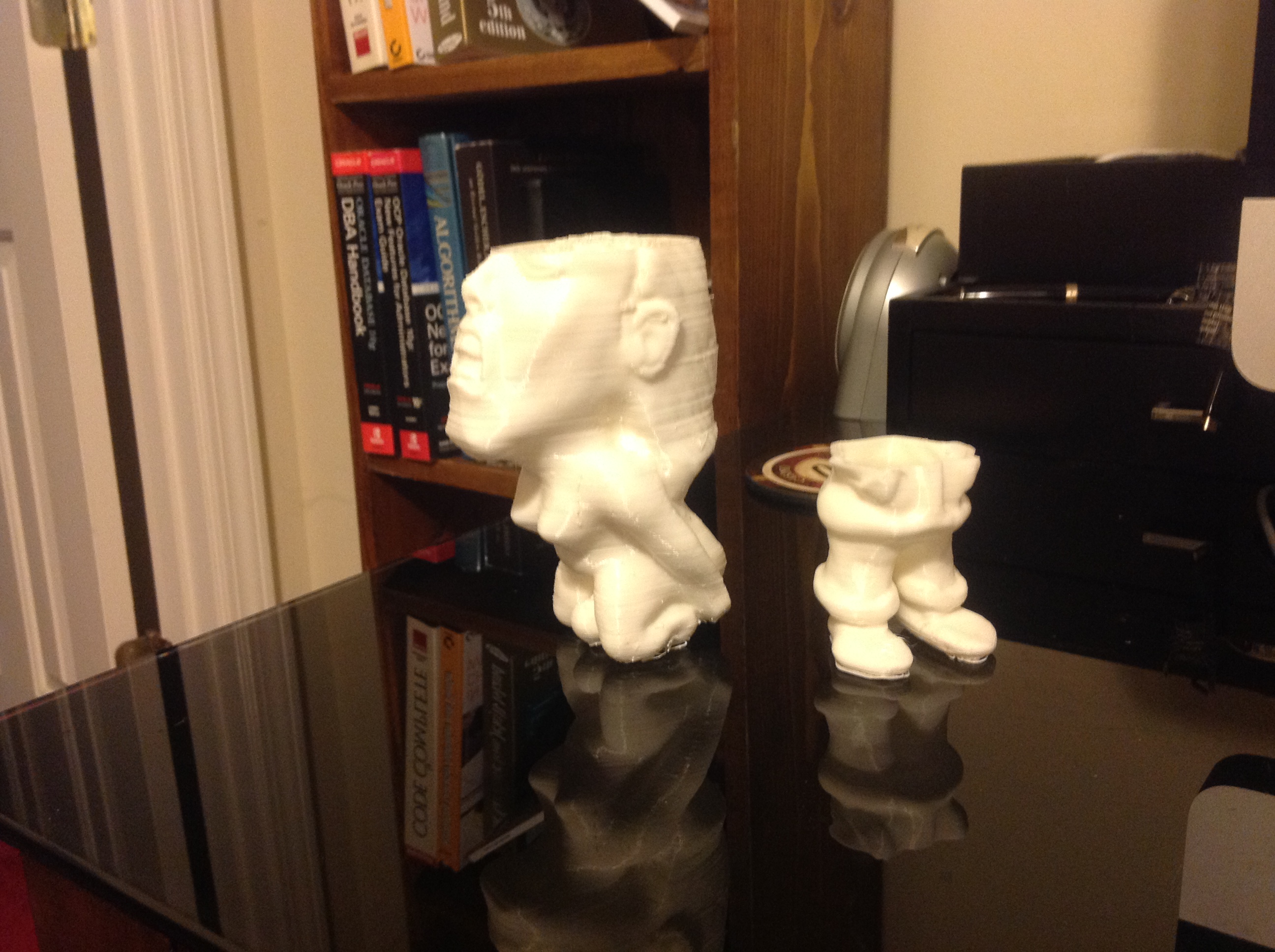 I did several prints over the weekend since I finally seem to have my hotend working (yay!). Most of the prints came out great. There are two that I ran into a problem with however. The first was this guy: http://www.thingiverse.com/thing:27408 He was printing great until about halfway through. It appears that the nozzle tugged just enough on him that he was spun and then of course the print was ruined. I initially put this down to the base coming unstuck for some reason. I wasn't in the room at the time so I can't be for sure exactly what happened. I do have a great looking half of a gnome is someone needs one..