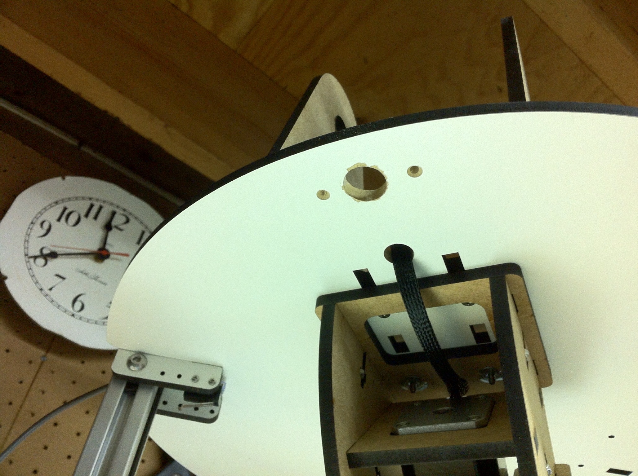 Of course, then I needed to run the extruder wiring up to the top. So I got a piece of plastic tubing, and made holes for it where the side-mount extruder used to be. I took a couple leftover pieces from the laser cuttings, drilled holes matching the ID of the wiring conduit, and used them as retainers.