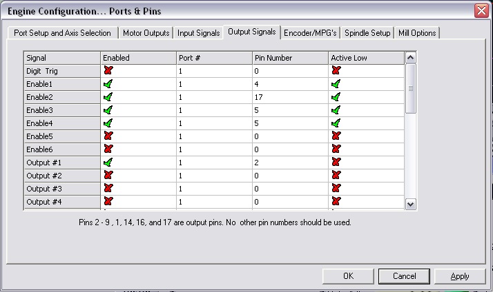 If your motors go 'dead' when you reset the e-stop, check this: Following MHackney's post screen shots above, and specifically referring to the "OUTPUT SIGNALS" tab on the "PORT & PINS" dialog box, you might need to reverse the "Active Low" settings. We had to do this on one of our PC's at SeeMeCNC headquarters. If the 'enable' pin and "Active Low" settings on these outputs are reversed, the stepper will receive power during an "Emergency Stop". Then turn off when the E-Stop is reset. Simply open the "PORTS & PINS" and go to the "OUTPUT SIGNALS" tab. Then reverse the setting under "Active Low" for each "Enable 1, Enable 2, Enable 3, Enable 4).