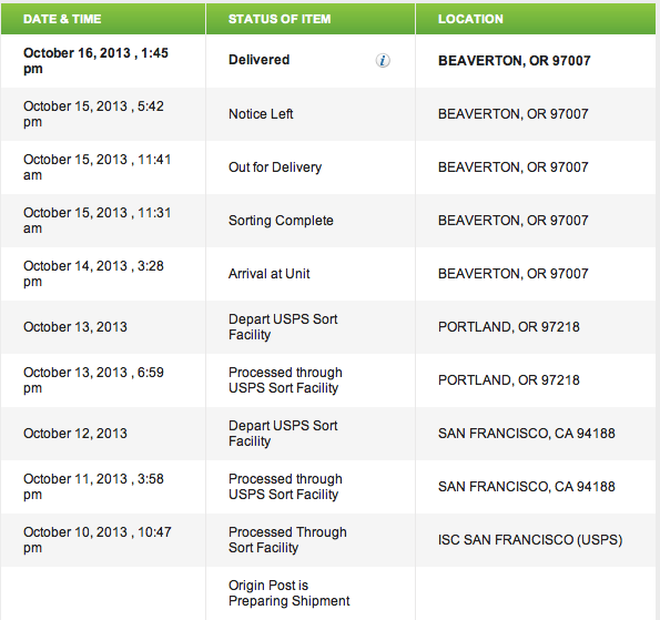 Mine came in through San Francisco and took about 6 days from when it first got there to get to my home in Oregon. Here's what the USPS tracking looked like, so maybe you can compare the timeline/comments:bubbasnow wrote:Usps had it in L.A. on the 26th but the site still says it's in L.A....but I don't know if it won't update until it's delivered or if there was a problem with the package.