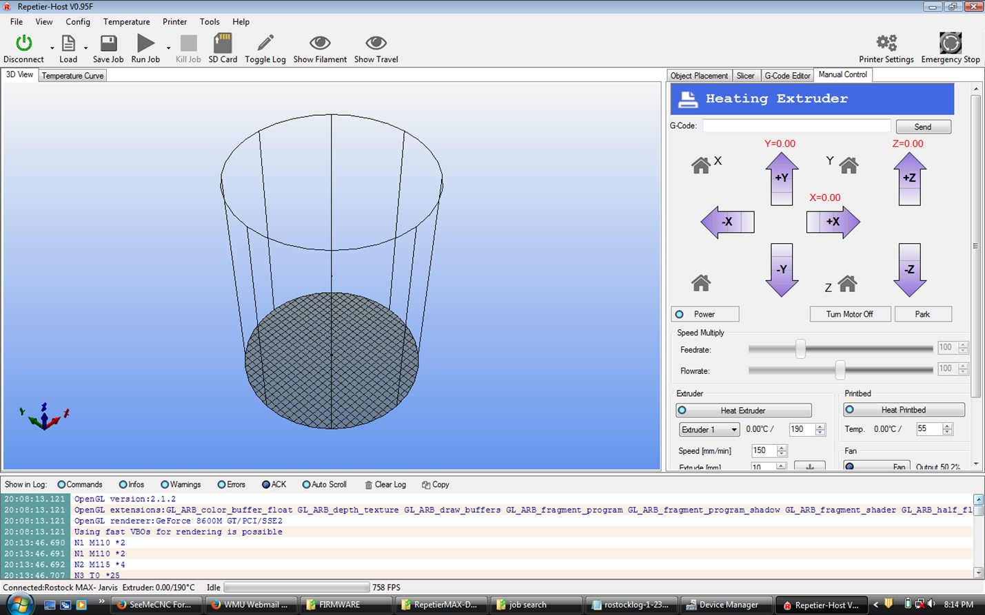 I first got my Rostock MAX up and running on Monday, and I could print from my computer just fine. Tuesday night I finished soldering the LCD to RAMBO board (I somehow missed that step right up until the guide said to plug the LCD in, and I had nothing to plug it into