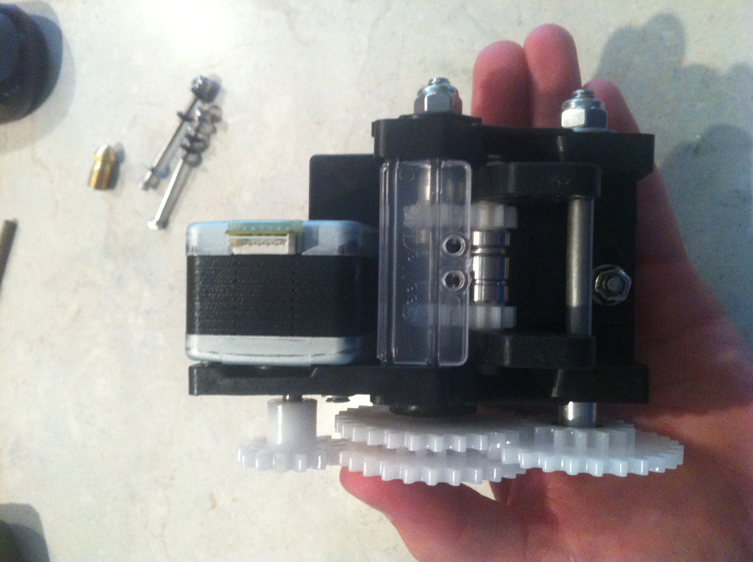 Yeah, I hadn't anticipated rebuilding my extruder but had to do so last night cause I got oozing from the sides (my fault). I am using the new black plastic parts for mounting the bearings, gears and extruder. Much more solid!kilroyo wrote:Nice !! those parts look beefy compared to the older parts