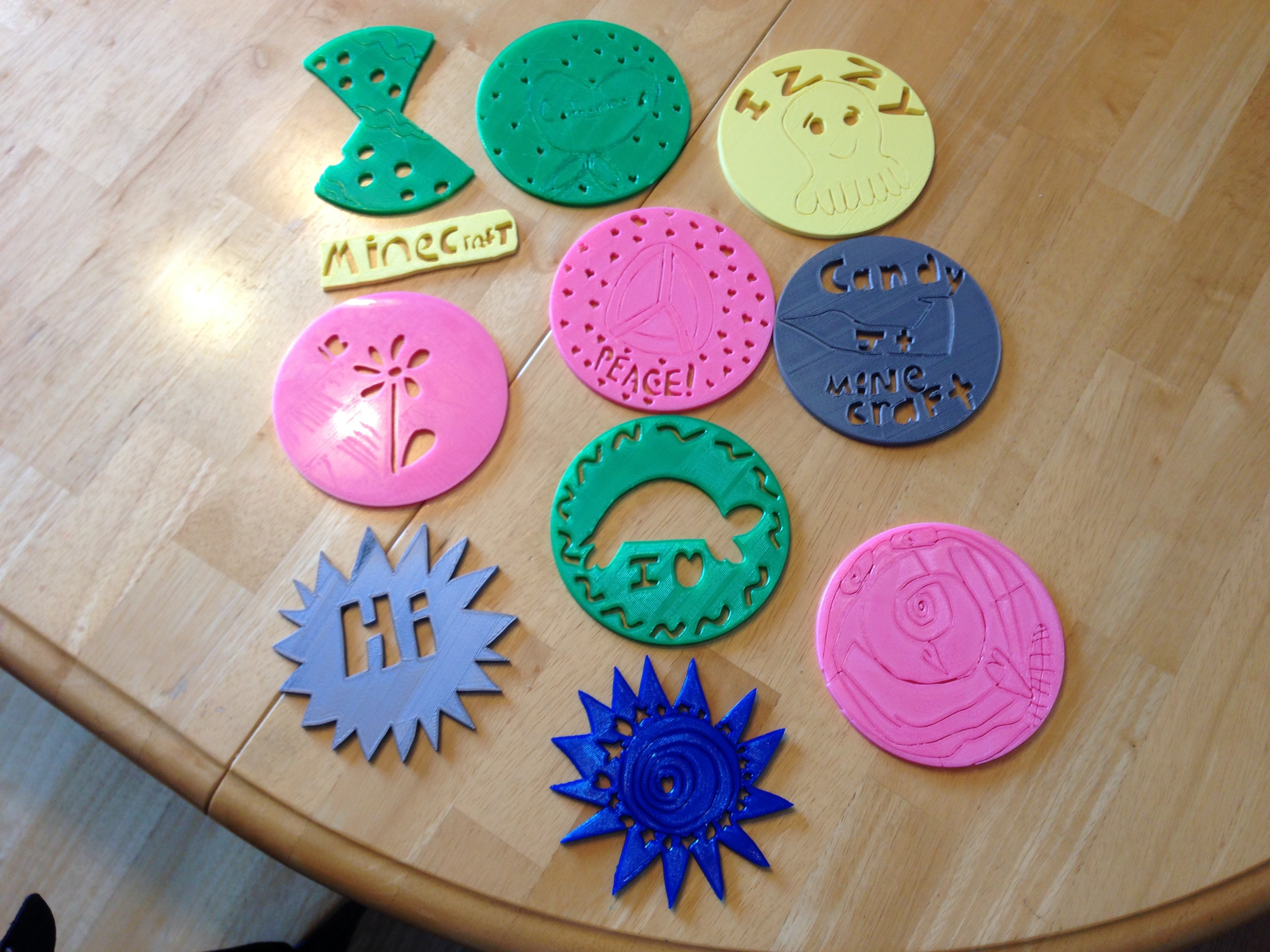 The second week of class I had the student peruse Thingiverse to get ideas of things that can be designed and printed and allowed them to pick something for me to print for them (I also had to go over all the first week stuff for my 5th graders who were at camp the week before). For the third week I decided to have them design something that just required pencil and paper, no 3D modelling skills required. I printed out sheets of paper with a circle and told the students that with a pencil they could virtually carve out a design. I then scanned these drawings in and turned them into prints. Interesting output.