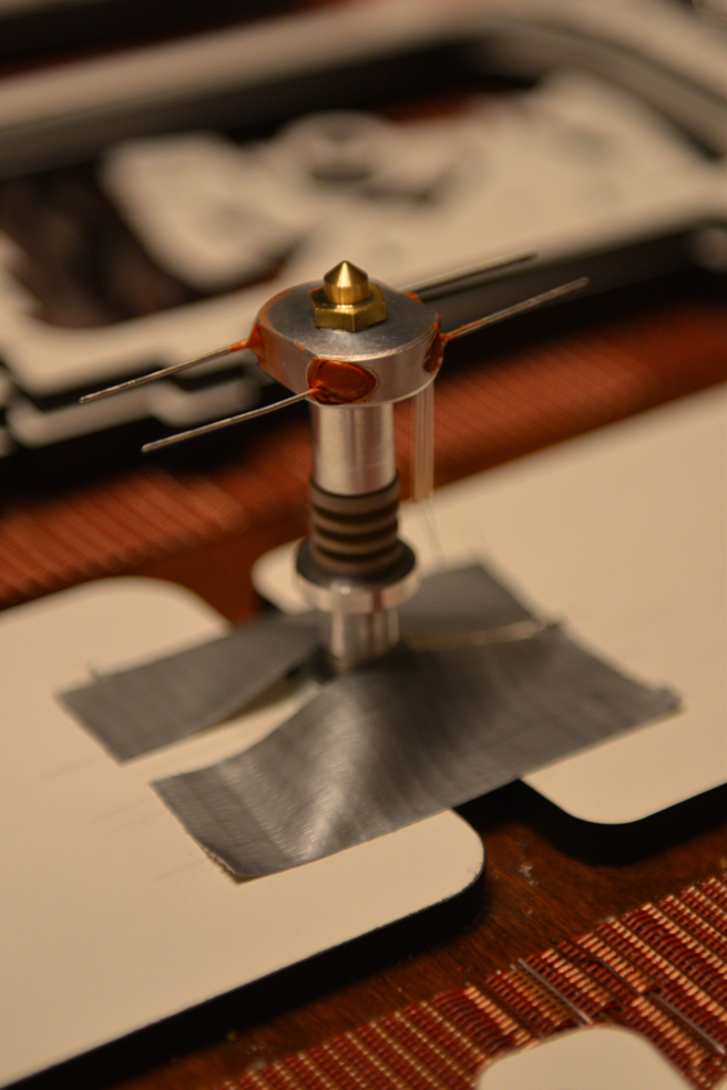 I went ahead and installed the resistors and thermistor in the hot end and taped it on a couple of scraps of Melamine to dry overnight.