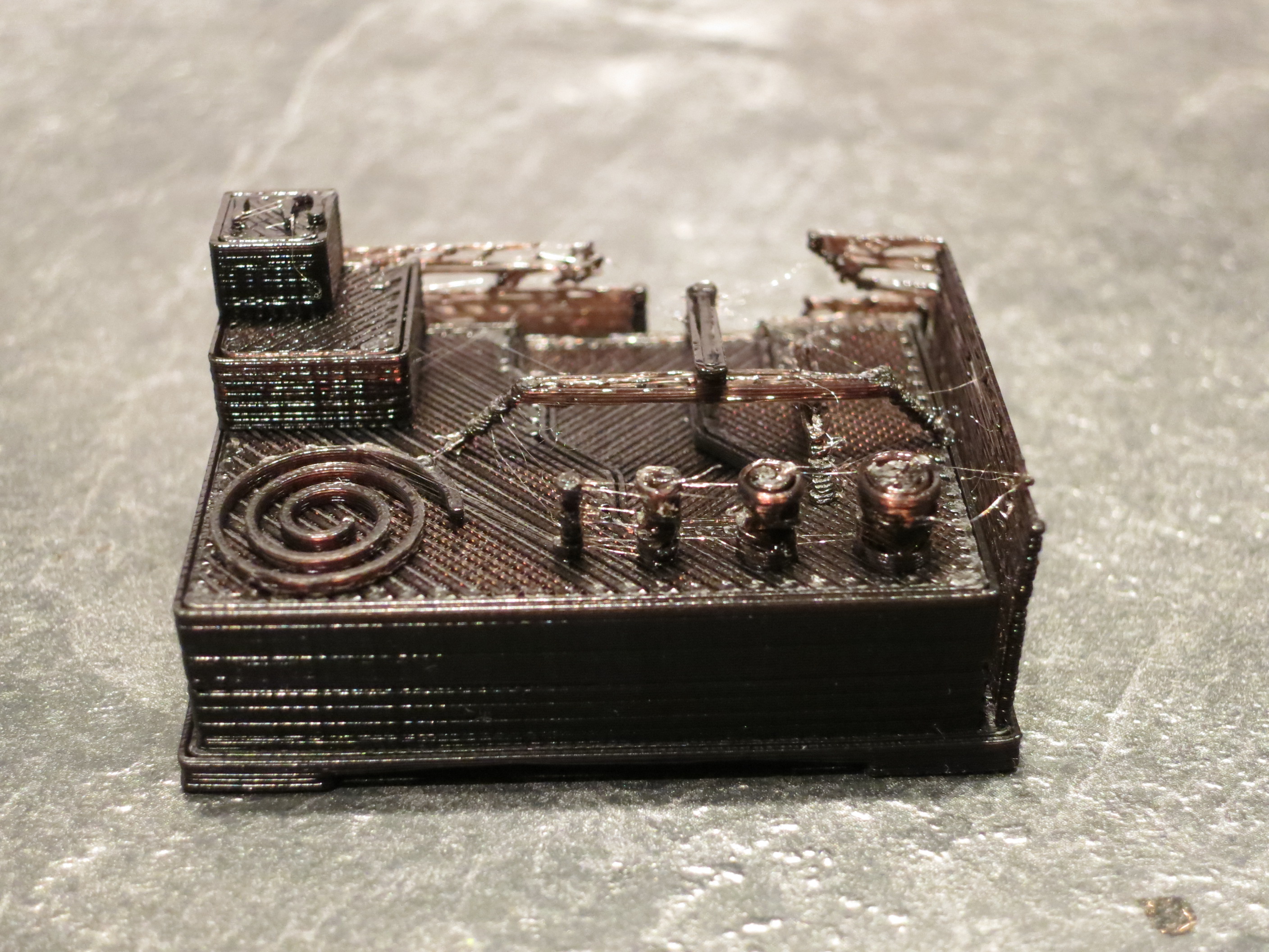 Cura was OK but just didn't quite get what I wanted in terms of tuning. Printing in ABS means a wipe with a brush dipped in acetone just flashes the cobwebs away.