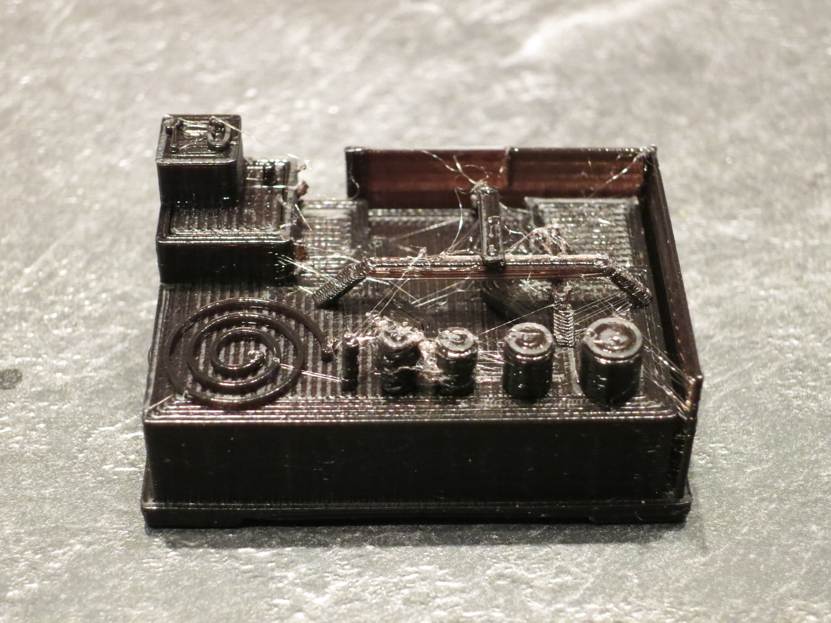 With Slic3r, it at least tried to print everything (except the '.' in the 1.0). It got the back wall and the tiny cylinder on the first square block. The spiral pattern was nice and crisp and the walls were good and thin. The pillars leading to the bridge were excellent and the bridge was so-so. A bit of sag on the first span then the rest went pretty straight. The row of cylinders turned out pretty decent as well. As with KISS, there was a bit of gap in some areas between the outer perimeter and the inner, but it seemed to be primarily isolated to the larger square.