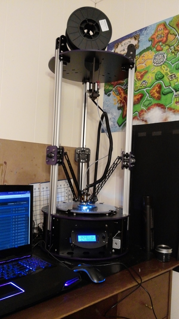 Here's my Rostock MAX I got last month, already did a few mods on it, added the purple accents, swapped out the junk PSU it came with with a high quality ATX PSU, added a fan for the RAMBo, the fan came with the kit but didn't say to do anything with it and I figured adding it to the RAMBo area would be a good idea. I also printed out a layer fan bracket and 2 additional corner brackets because I had an issue with the shaft on the platform working it's way out the end and having one of the arms come free. I suppose I could have just tightened the screws but then it deformed the platform and the joints would stick and then I would have had to take it apart and do more sanding which I didn't want to do at this point, so the little corner brackets keep the rod from sliding out, they also act as an LED holder for an LED I already had laying around which I put in one of the locations.