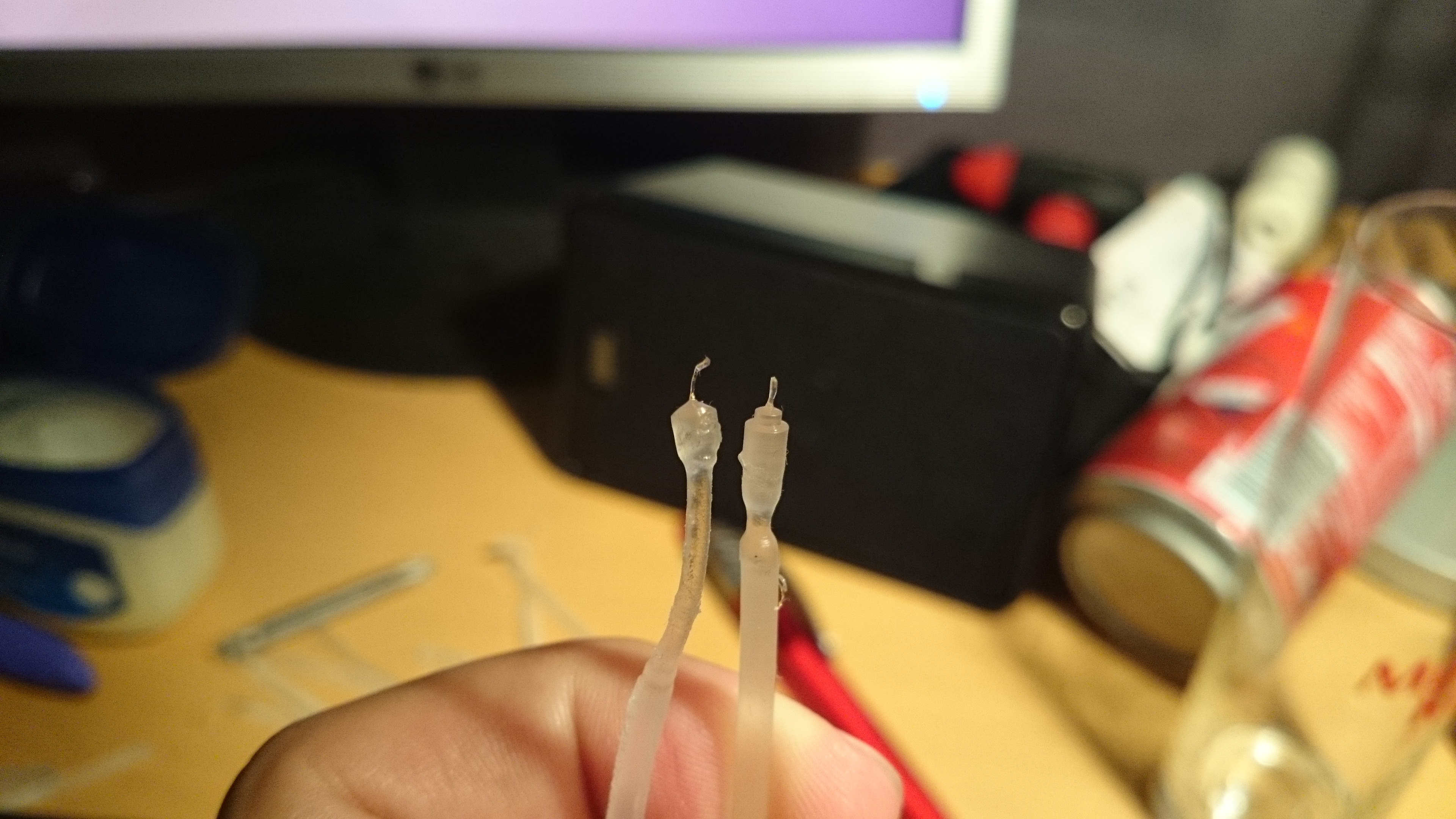 Then I grabbed a 2mm drill bit and tried to dig down another 1 mm into the nozzle, reducing the bore to about half its original size. After trying to do this, i've re-measured using the vaseline method. The tip of removed PLA probably strechted a bit, BUT: I quite accuratly removed 1mm of the bore. You can see the beatifull 2-staged rocket that is my rocket now.