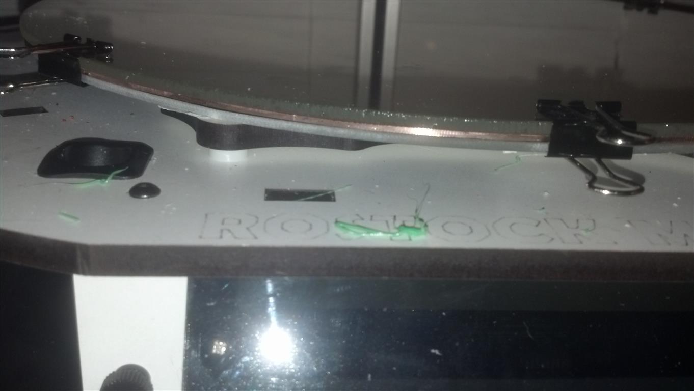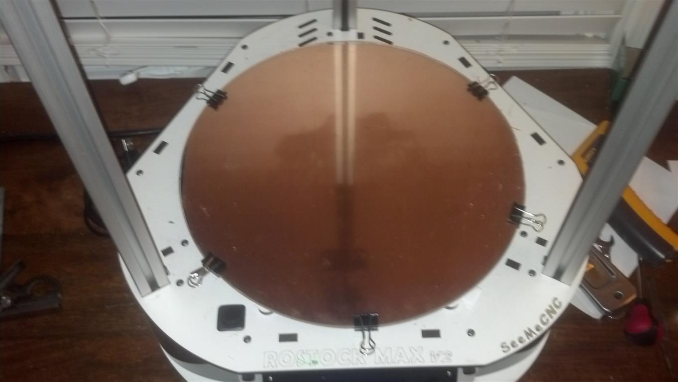 The circle (with clipped sides) was sawed out of the square using a Scroll Saw and a couple of blades designed for wood. Checking closely there seems to be about an 8 degree difference in what the bed thermistor reports relative to an interferometer at 95C, at room temperature it appears to be correct. Next step is to verify the error to be correct and correct the thermistor table.