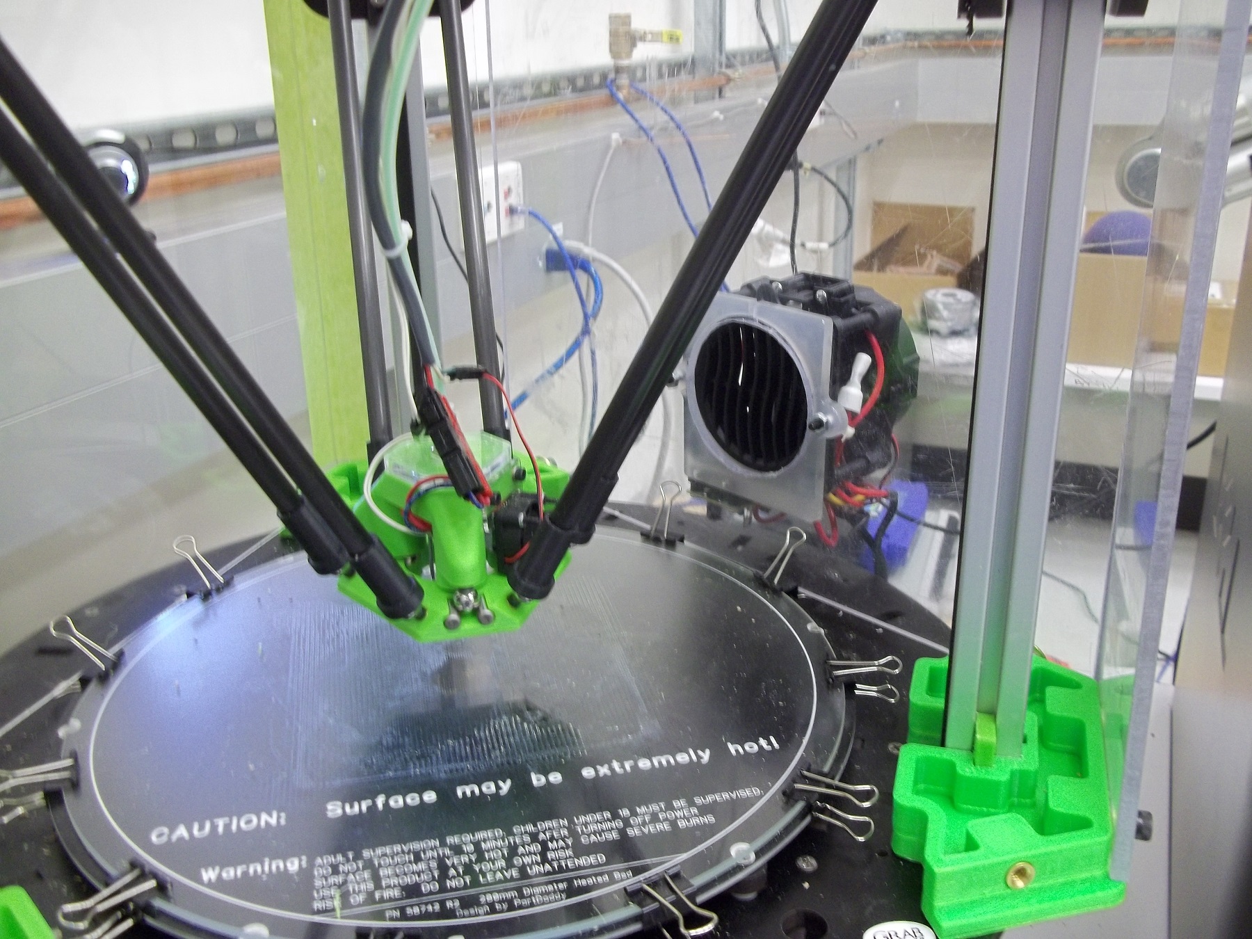 I have not yet tried running both simultaneously, and I'm not sure how the lifespan of either heating element will be affected by the temperature controller turning them of and off repeatedly. In terms of aesthetics and efficiently utilizing space, I really like the IR lamp placement, and if I place the temperature controller thermocouple on the moving effector, I think I can actually modulate the temperature with respect to the layer height, which could be really cool, though not necessarily useful.