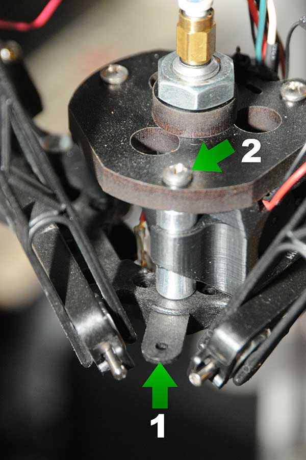 I am having some minor issues with my calibration and was thinking about using a dial indicator I had laying around. I would prefer to set it up so I don't need to remove the hot end to use it. I was thinking about designing a mount that hangs of a bracket holding the arms (1), there is unused hole, and then if there is too much flex run another arm up to the top bracket holding the hot end(2). Will not having the indicator in the same location as hot end make any measurements worthless as the geometry will be off? I would prefer not to have to remove the hot end to check calibration. Is anyone aware of a Rostock MAX mount stl file already out there to mount a dial indicator while keeping the hot end installed?