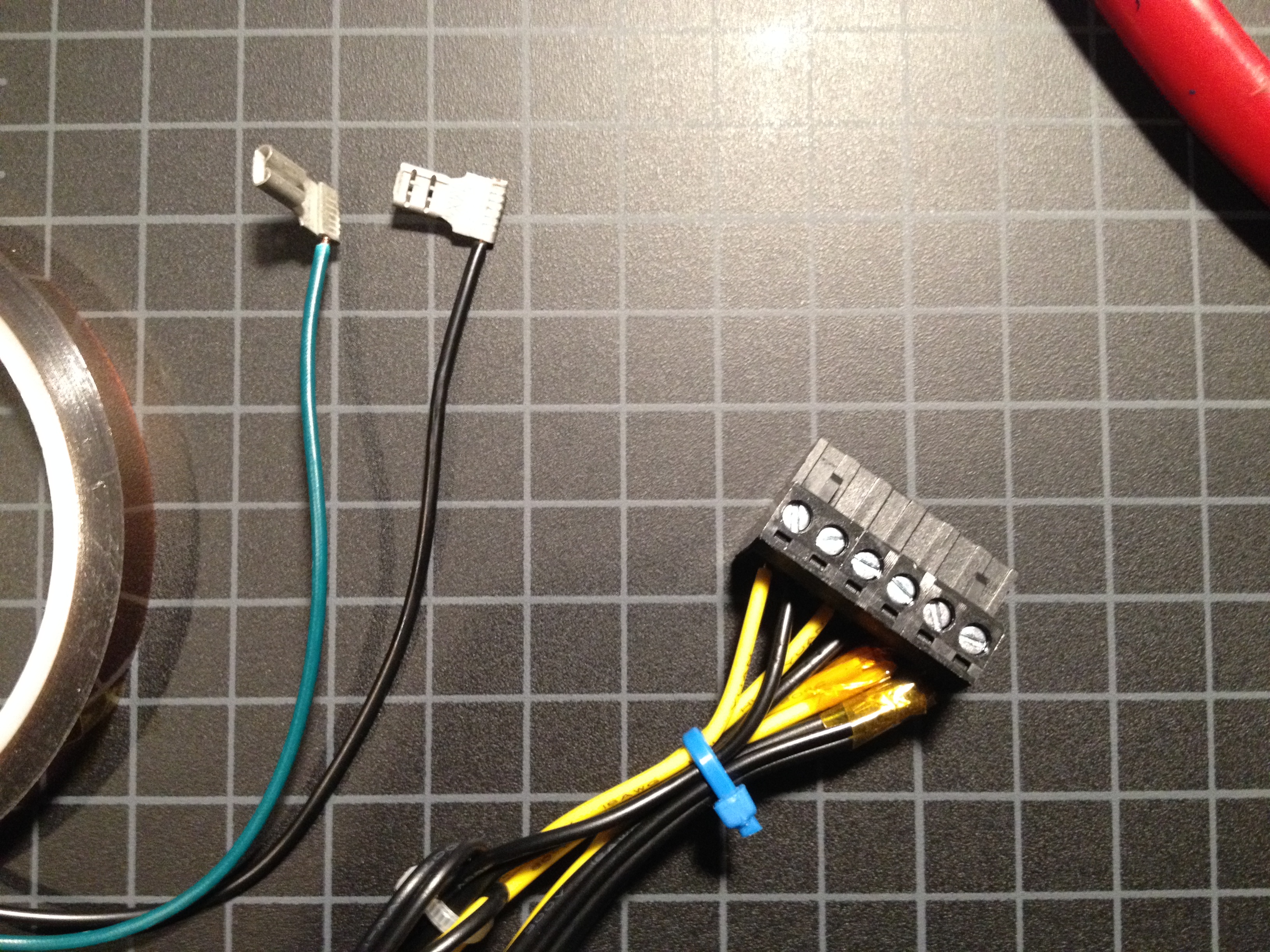So I decided to go with a separate large two-pin connector for the resistor heaters and a smaller two-pin for the thermistor. Mostly for reasons of wire gauge. I decided to go with smaller 22g wire for the hot end thermistor instead of the supplied 18g.