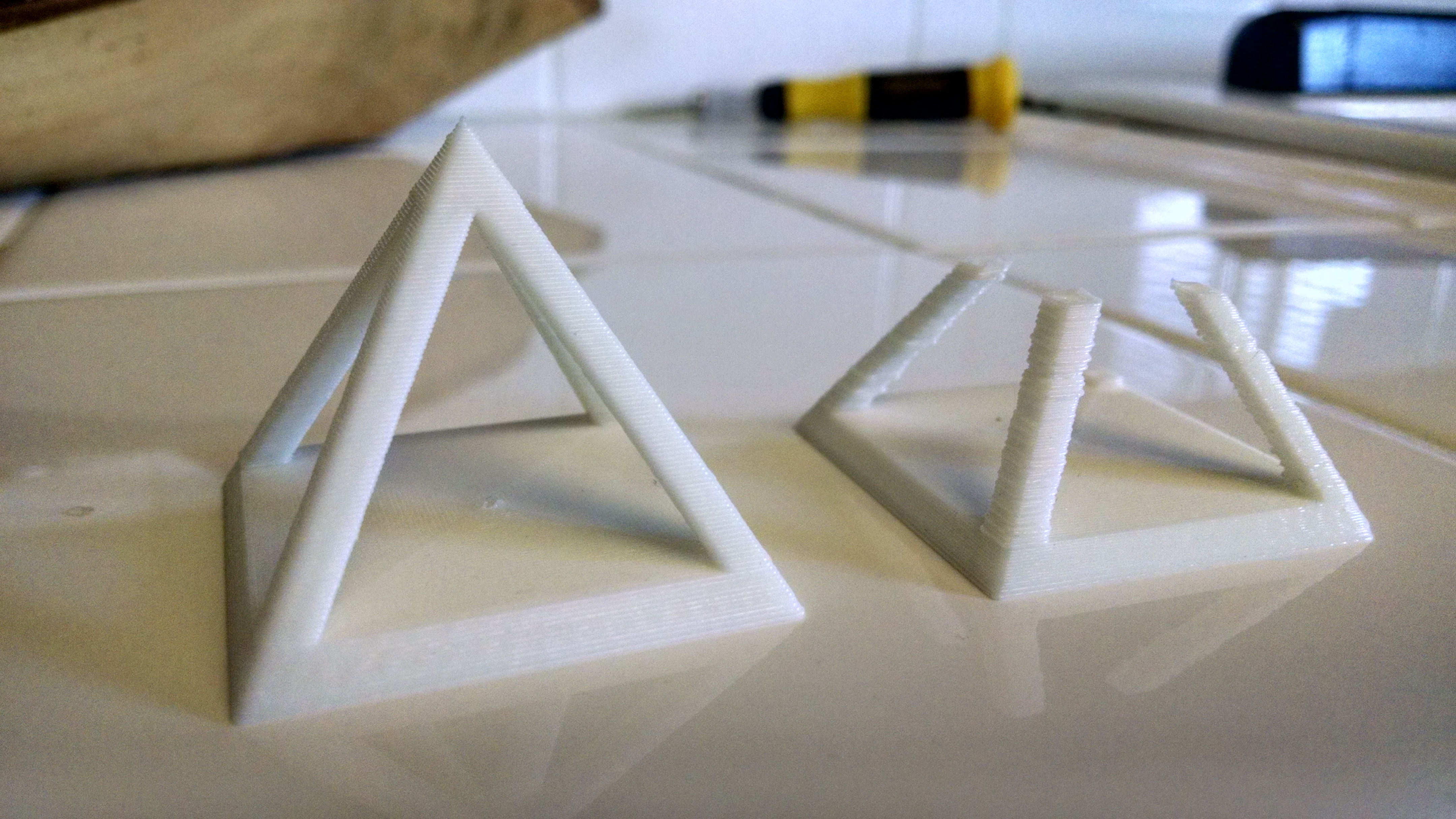 So I'm about a month and a half into printing on my V2( E3D v6 hotend, .4mm nozzle, TrickLaser CF arms), and I've had great results with ABS so far. I started using PLA this week, and I'm using the Hollow Pyramid to get a feel for it. After about 4 or 5 unsuccessful attempts( which I attribute greatly to the Shaxon PLA from Frys-its seriously 1.67-8 dia. on average and the first 5m was kinked and speckled with black, the first go looks like a geometric Dalmatian) I landed with the one on the left: