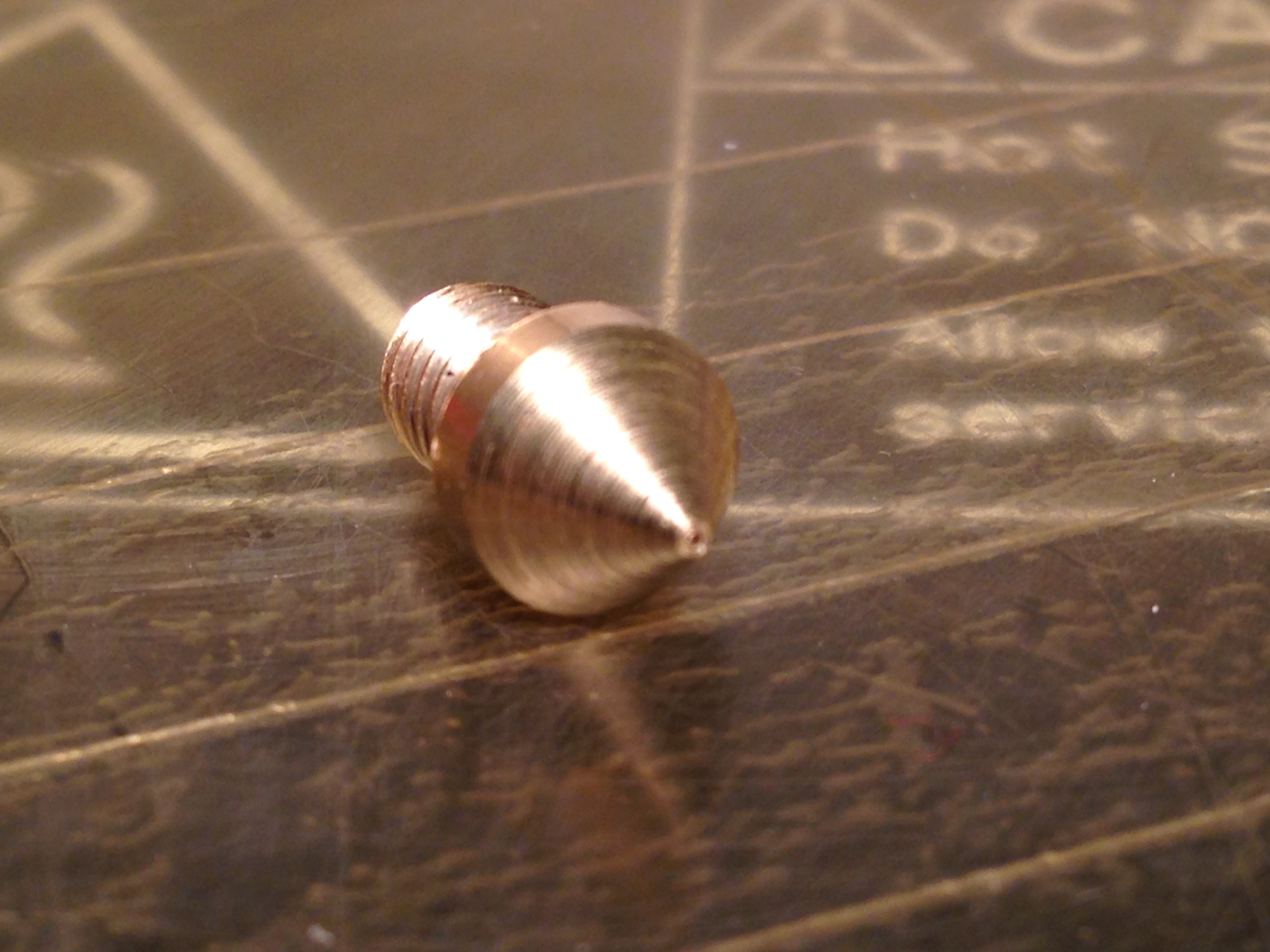 I don't know how well it will work with PLA (the angle of the bit I used to drill it out was a standard 118 degree 2mm bit, so its a pretty sharp transition from 1.75 to .36), or how well it will work in general. I'm hoping I'll get some pretty nice surface finishes out of it, I've said before a little bit about my theories on nozzle design performance and quality (sharper the point the better the finish, but if its taken to extremes (the Merlin hotend) it can impact performance). This is assuming the internal angle (transition angle? I don't know proper terminology) is pretty close (if not) the same as the outer angle. More simply put, the sharper the point of the outside, the better the surface finish, and the sharper the angle on the inside, generally the better performance. This is all by observation of the different hotends I've used, and the different prints I've gotten from them and from what I've seen of other's prints.
