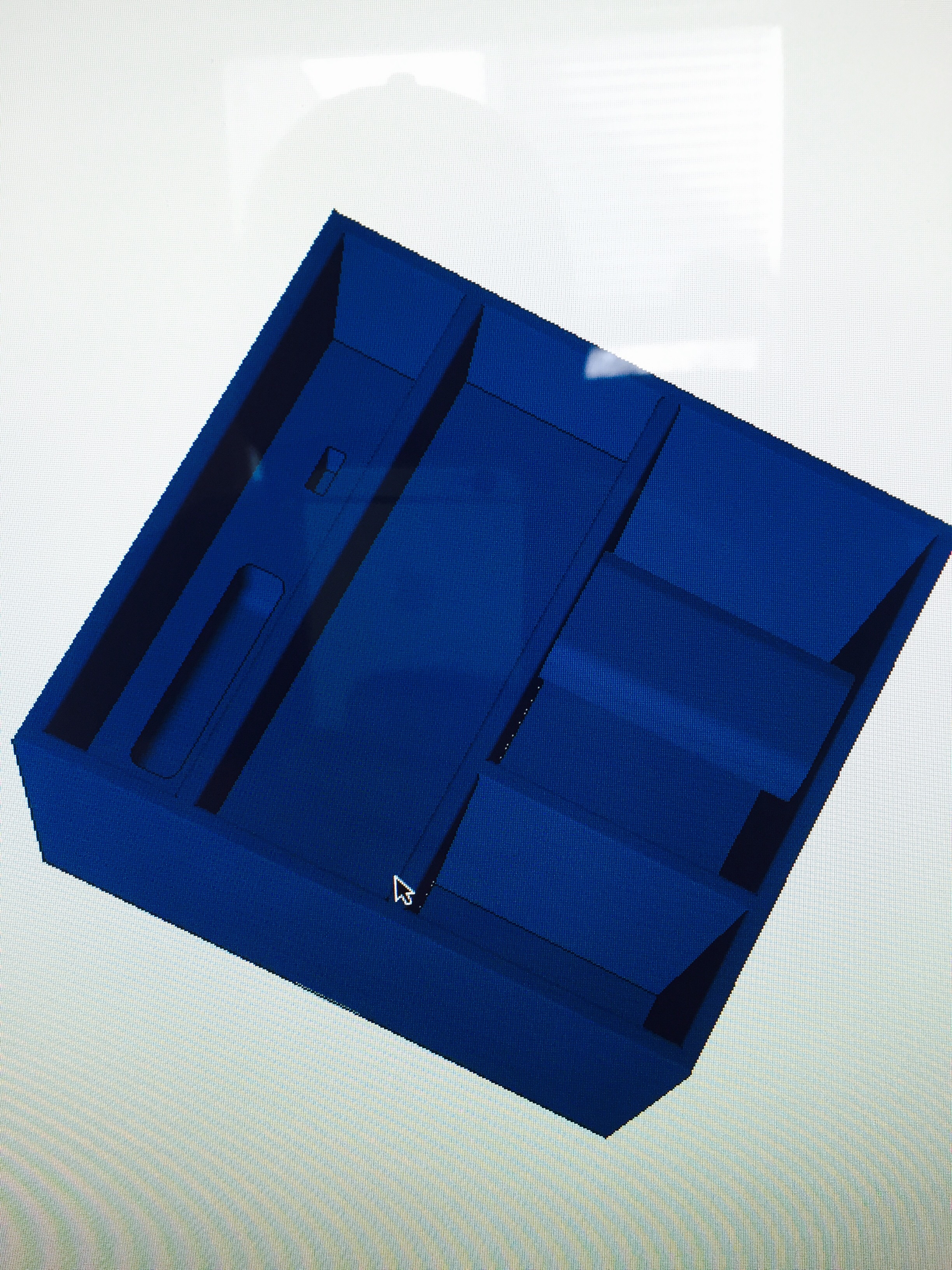I used too dense of support material in the square cavity (a future drawer) and it was a real pain in the butt to remove it. You can see from the top view the I scratched up the face of the box and damaged/stretched the floor of one of the "bins" (white marks) with a screwdriver trying to remove the support material.