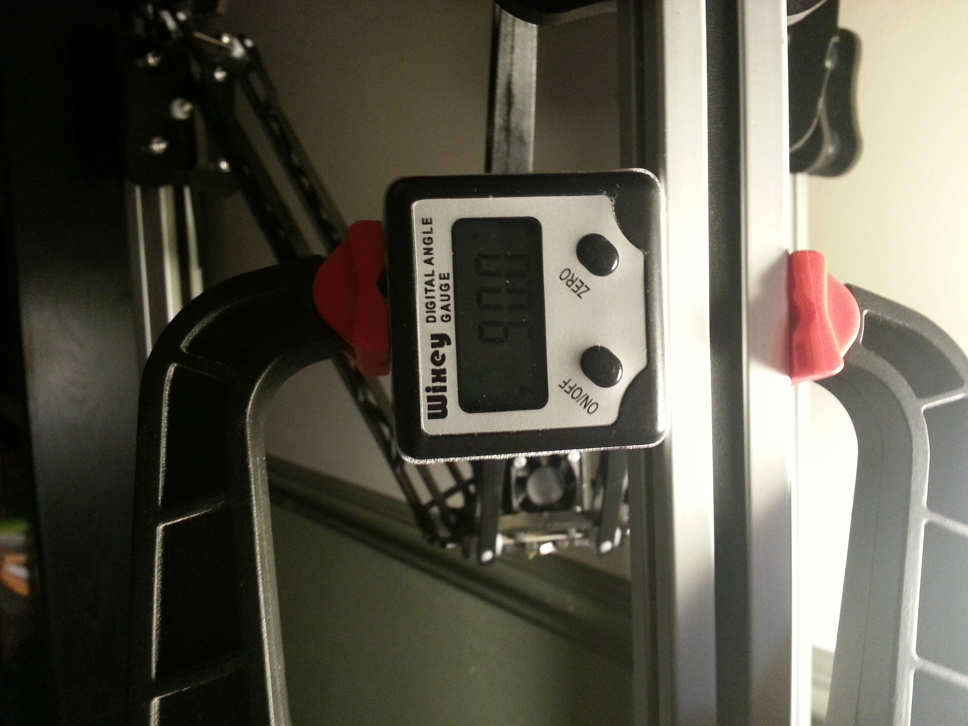 Next was the left/right tilt of the tower that the manual didn't cover. I ended up purchasing a Wixey WR300 Digital Angle Gauge from Amazon which solved this issue and the one above. It's way easier to zero the gauge to the bed and align each tower while it's clamped to the towers. I'm not sure how you can check/correct without having a digital gauge.