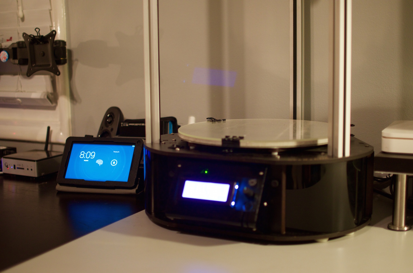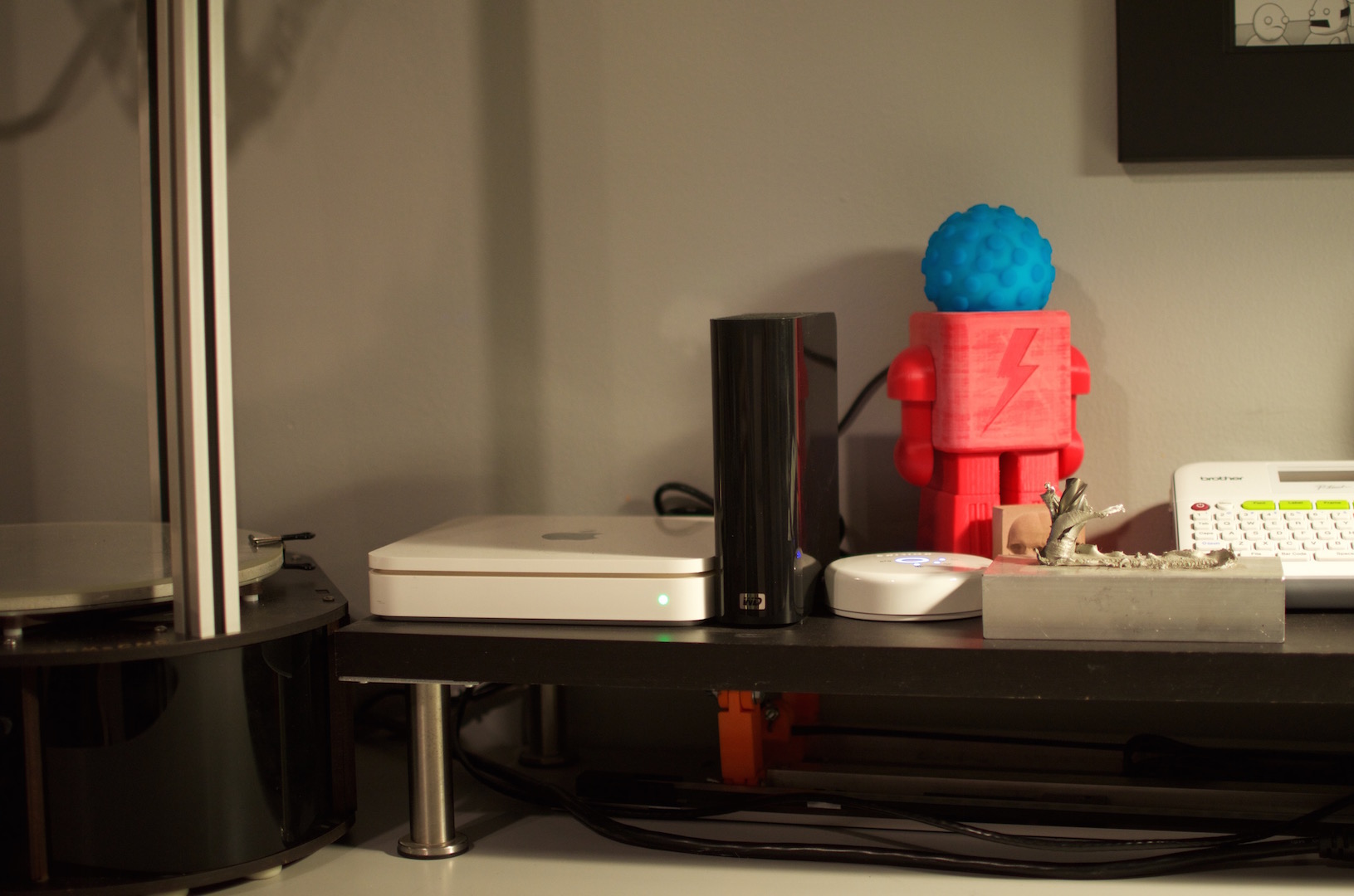 I got my Rostock Max v2 at Maker Faire Bay Area 2014 and never actually got around to sharing my setup, so here are some photos featuring my printer in all its glory: