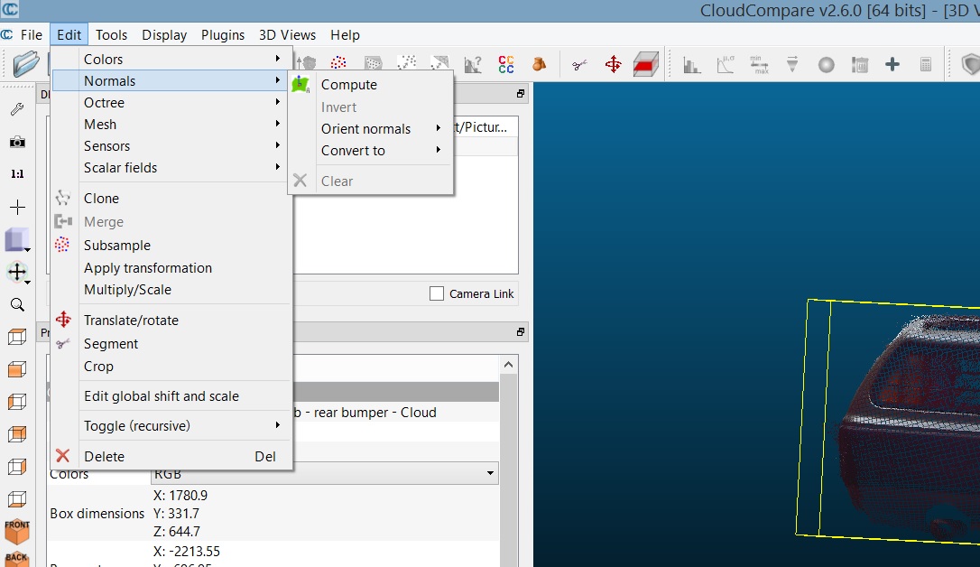 Normals (I think) means orienting the points in a unified direction. With both Computing Normals and Poisson Surface Reconstruction, you have to have the mesh or the Point Cloud selected. You can't perform the Poisson Surface Reconstruction without computing Normals first.soul_reaper_38 wrote:Do you mind elaborating on how this works? I have my Faro scan project in CloudCompare right now and I see the Poisson Surface Reconstruction plugin, but it is grayed out. I don't know what you mean by building normals.