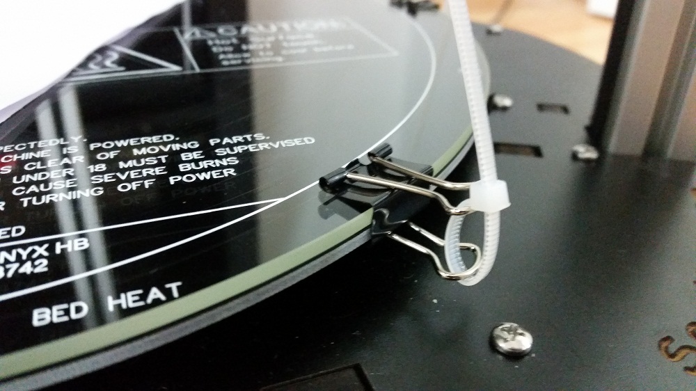 Well, I made my second mod to my printer to cut down on the noise. I added some zip ties to keep the binder clips from vibrating. What I'll probably do is wrap some silicon tape around the handles the next time I take the glass plate off.