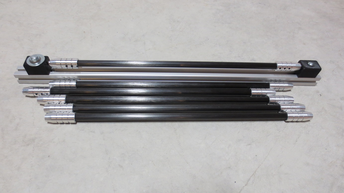 I don't have any saws so I can't cut my 0.5 inch CF tubes to equal length. The aluminum ball sockets on each end of each CF tube can slide a bit, and have close concentric tolerances with the CF tubes. They are locked in place with set screws.