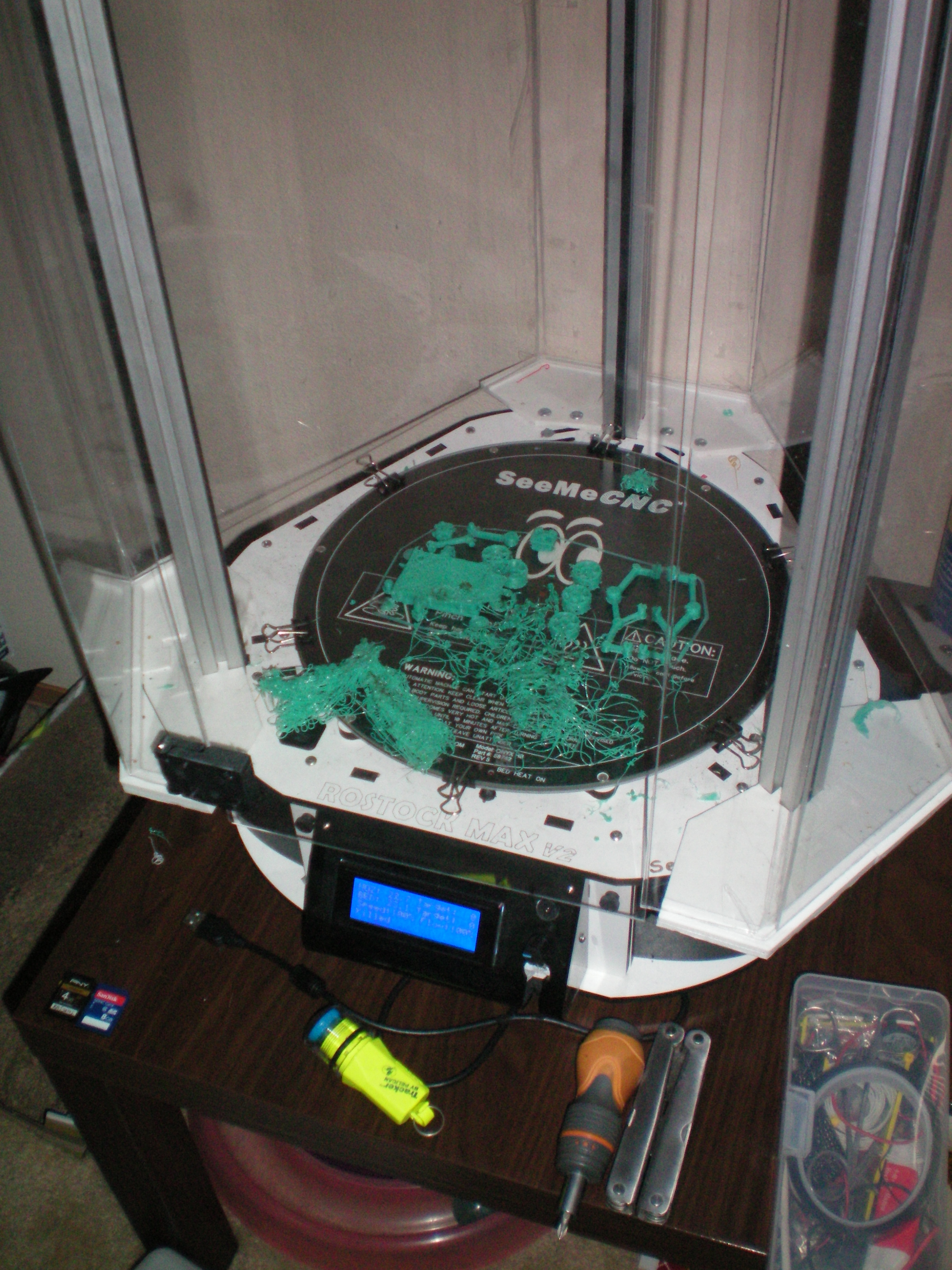 ok another extensive week of testing, work and failure. i am pretty sure the power supply is not up to snuff as the components wear it cuts out to protect itself as it is too close to the power supply limits when everything is running for as many hours as i have run so i give up. for sale one rostock max v2 with several spools of filament in need of a power supply 1200. no shipping unless you are willing to pay for packing and shipping the bloody thing. i live in washington state. i will get a printer that is simplier and of a more proven design because this is not working and has not been working for far too long. it has been a pain in my backside and now i can get two others for the price of this one. good luck with yours