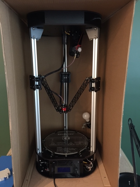 (Here's my printer setup. The box is to keep out drafts, the light bulb is to warm the place up. I may have to construct a fourth wall (with window) and place it at opening after printing commences.)
