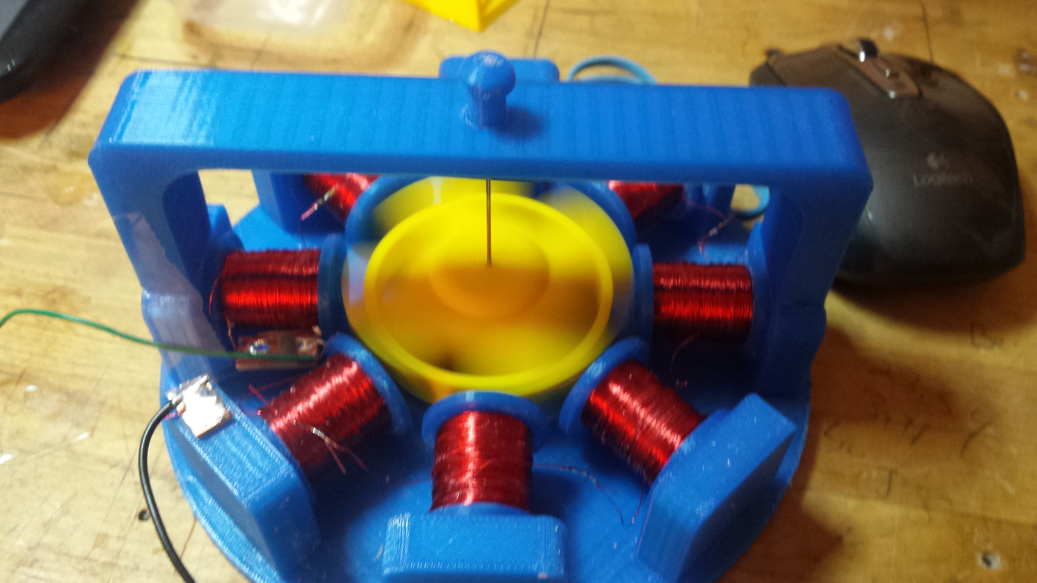 so here is the fun stuff with this machine, because of the low friction co efficient, and the hi gauss of the neo and where its switching, it does charge the battery very slowly. I put a completely dead AA on it, blew on it for a few seconds and it sustained rotation, been running ever since. I need to add a resistor to it to bring the current down, I can get it to run on even less, but with the resistor the battery will die. the next iteration will have the fan blades will be integrated into the rotor and the stator will be slotted.