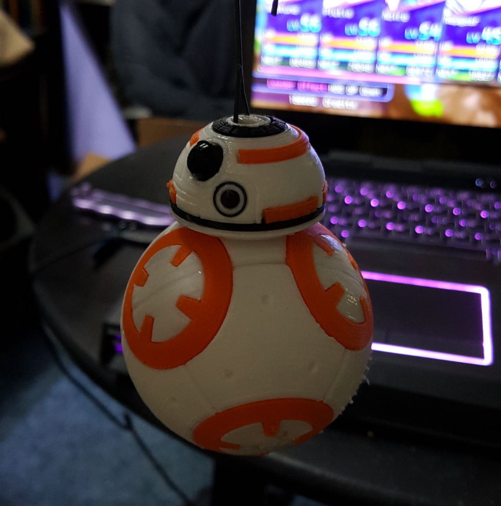 I started this tradition last year after getting my printer of making an ornament to send in a package with cookies to my closest friend, last year it was a power star from Super Mario Bros, this year with The Force Awakens coming out I decided on the BB droid from said movie. This year I was smart though and designed it and ordered the correct filament colors so I did not have to paint it, last years star was a time sink trying to paint the green filament yellow and paint on the eyes. I tweaked all the parts fitment based on how my printer printed out the parts so I could just print and assemble them with very little prep work, mainly just a bit of cleanup here and there with an x-acto knife and a sanding block.