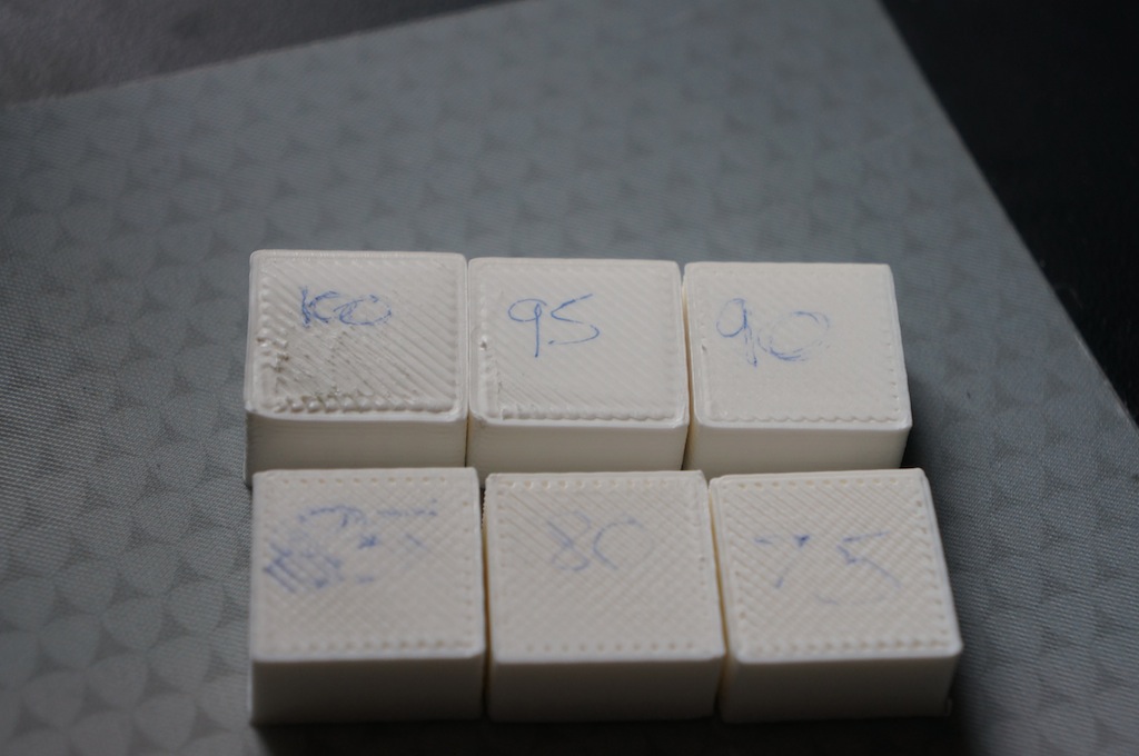 I use the same settings as above but I set perimeters to 2 and infill to 100% for the test cube, to illustrate in the following picture, I printed from 1.0 to 0.75 extrusion multipliers in 0.05 steps. The excess material is obvious on the 100% example and can be see decreasing through the 90% one, the 85% one looks good and if you look closely you can start to see small gaps in the infill and between the perimeters in the 80% and 75% cubes. So apparently my rough calculation above was good.