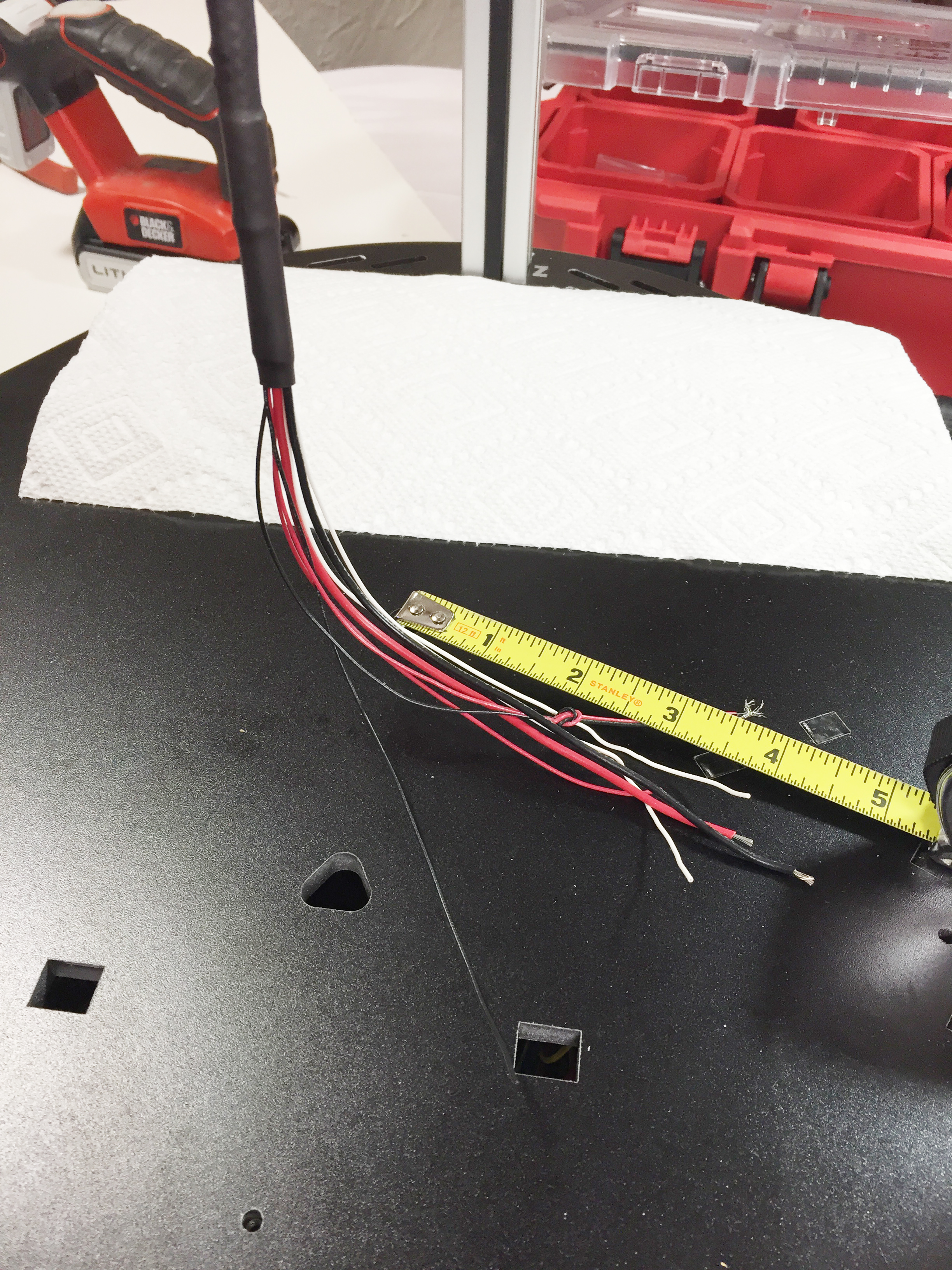 Currently the 'hot' end of the sleeve is about 3" above the melamine (the top of the base), and there is about 7" of wire exposed beyond the sleeve.