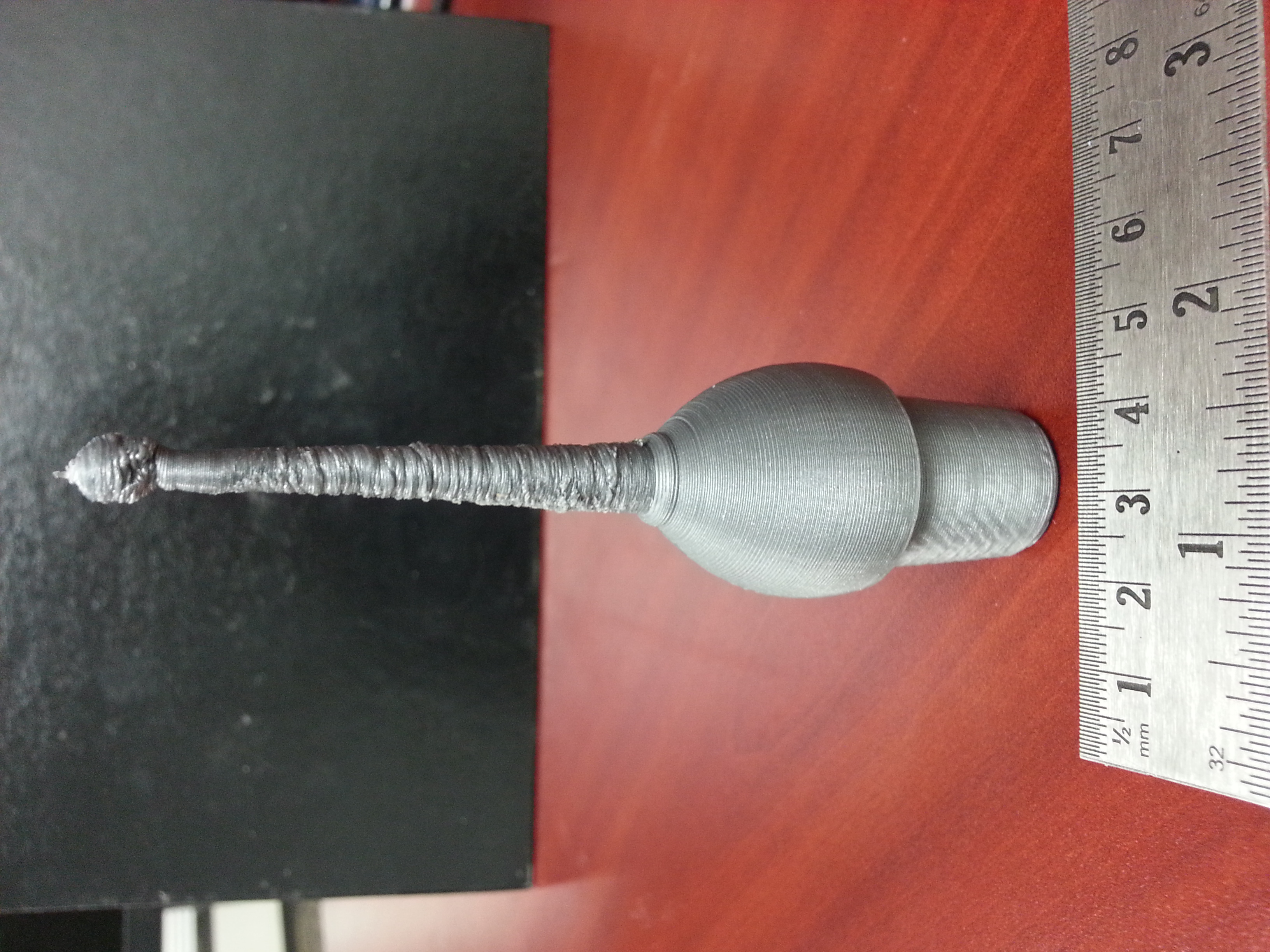 When I'm having difficulties finding the best settings for things I will often set them to extreme values to see what happens and adjust my way back something that works. So I set the flow rate to the minimum that Repetier Host will do (50%) and tried again. Photo 3 is the result. Better, but the ball is still bad. I likely will just cut the ball off and use as is.
