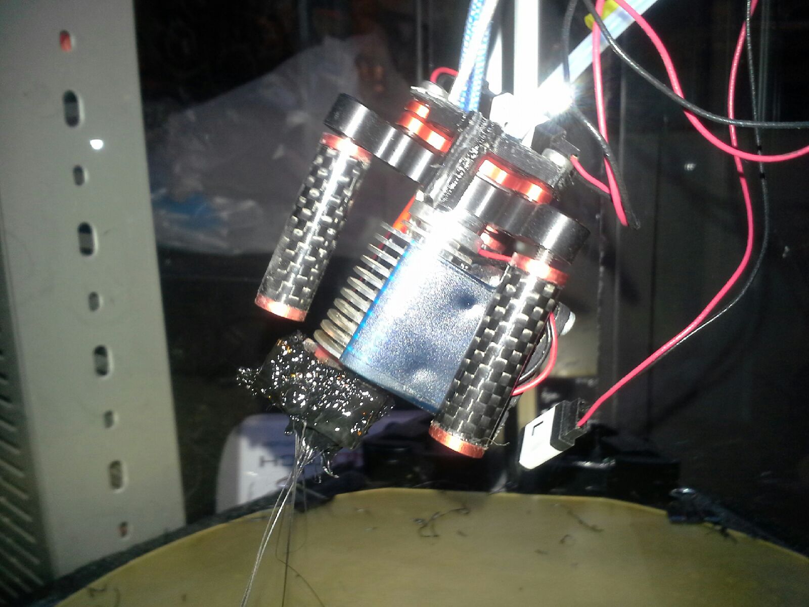 Then, partially because of that, the hotend mount came loose (Because I had forgotten to re-tighten the mounts properly (I would blame spending 10 hours each day on campus for a lot of that, because I had to come home and work on the printer on a tight deadline)