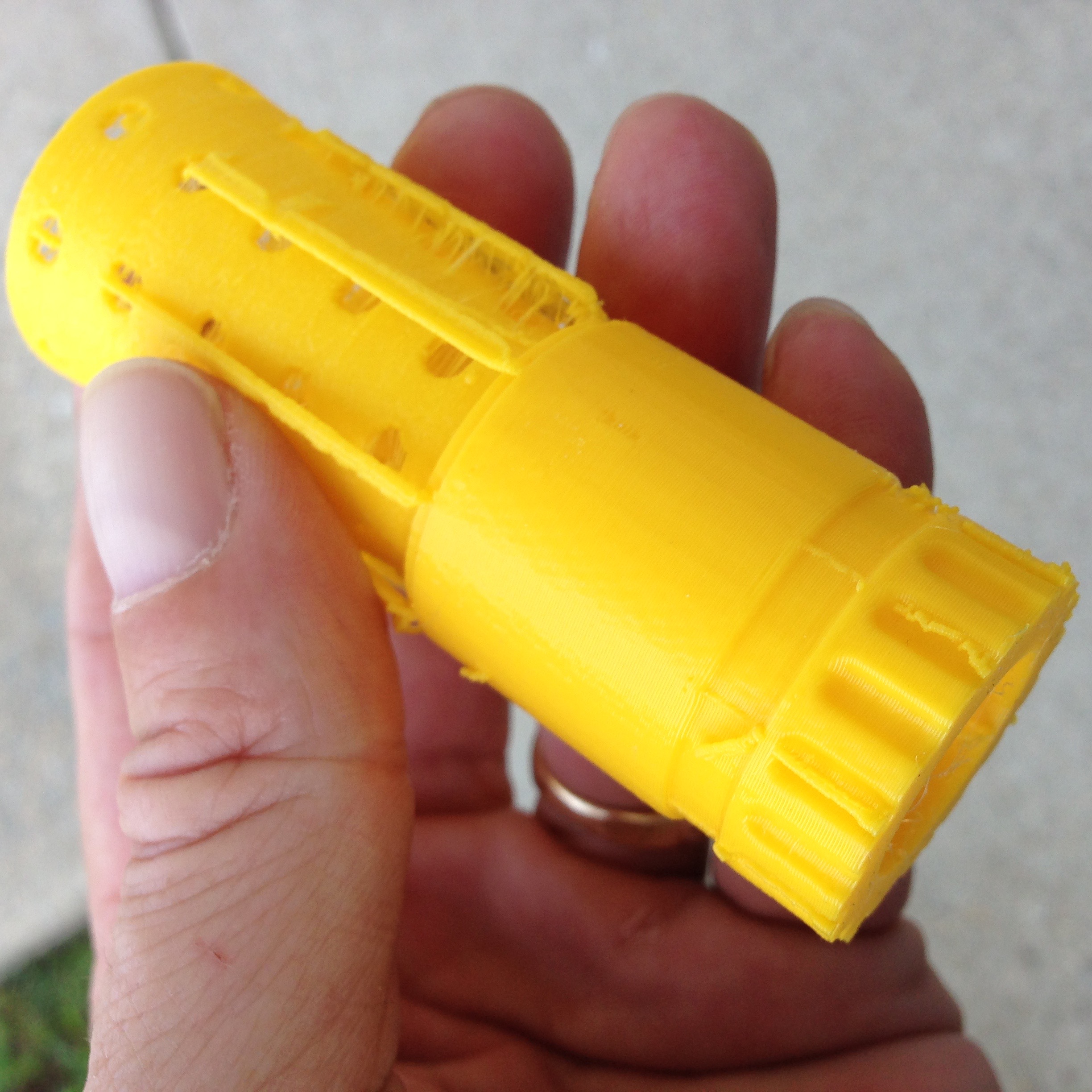 So the first piece is done. Printed at the defaults, about 5 hours to print. It was stringy and had some small pits in the side. At little bit of work with a hobby file cleaned it up quite a bit. I couldn't get it off the build plate with the removal tool so I finally just grabbed it and "snapped" it off. Also, this was the second attempt. First one simply stopped at an hour or so when the computer decided to stop talking to the printer.