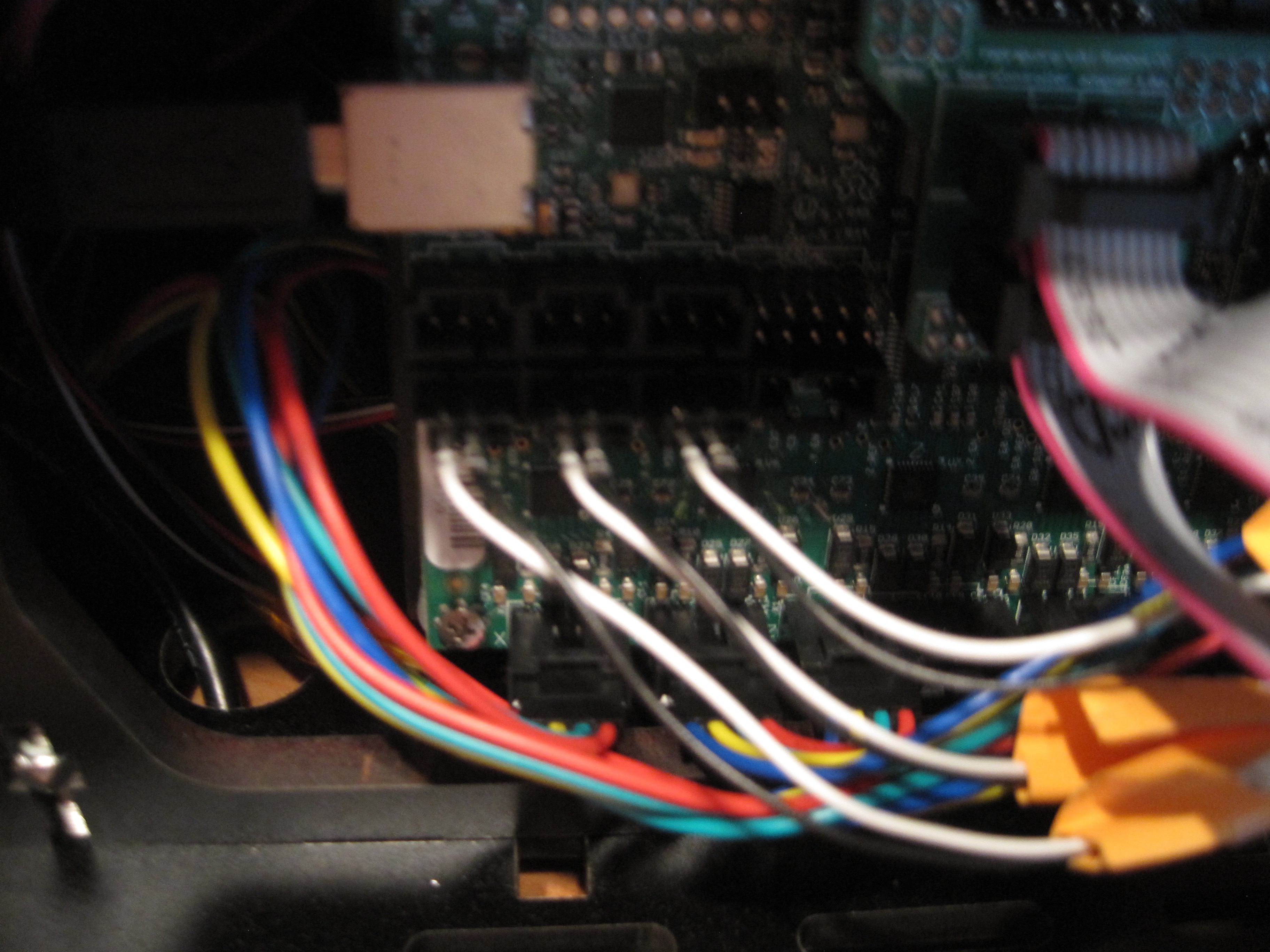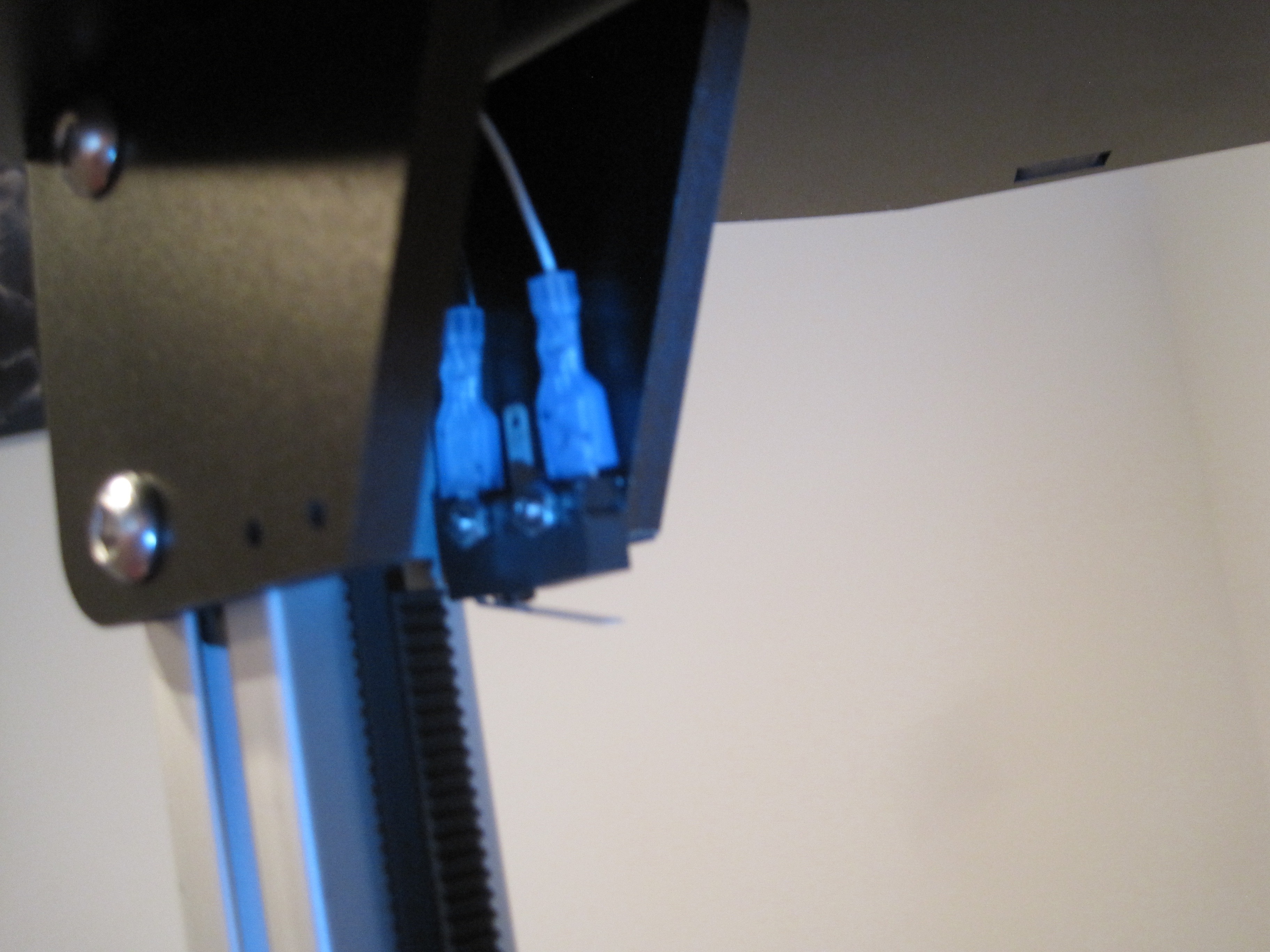 As for the connection to the motherboard, I connected the white wire into pin position #1 (with the arrow) and connected the black wire to the middle slot. I plugged the X, Y, and Z end stop cables into the lower sockets on the left hand side of the motherboard (labeled max-height stop or something along those lines).