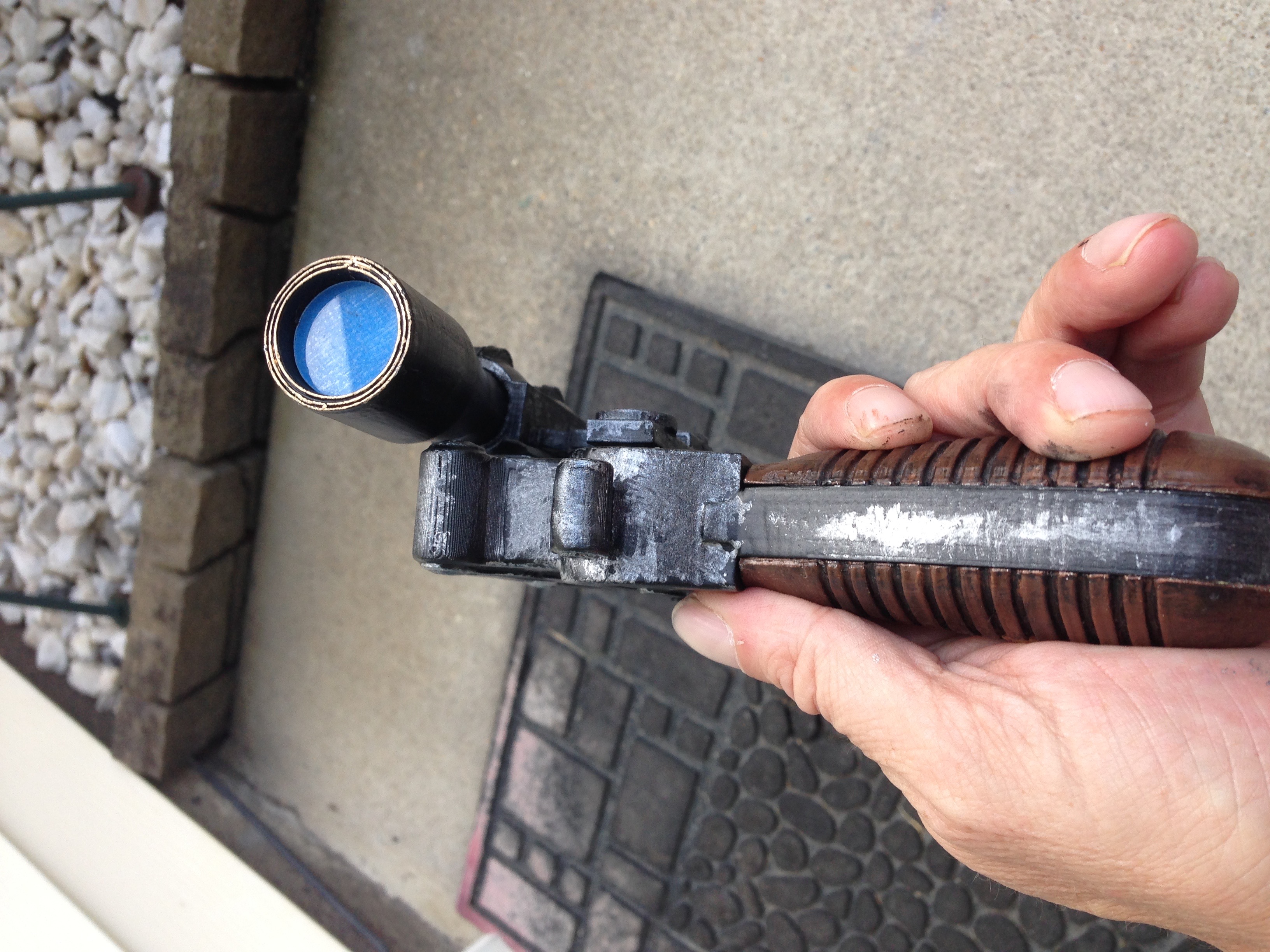Yes, precisely. It's a bit time-consuming, far more so than using a chipping medium, but it's cheaper to implement and let's you turn a stage quality (quick and dirty) to a display quality prop without starting over on the paint.Milamber wrote:Lol...now that I know about it, I have to do it! Are you saying that, with this technique, to use whatever the base coat color is? i.e. If the blaster had been, say, grey, outline it in the same shade as the base coat?Xenocrates wrote:Just use a small (00 or 000 is what I prefer) brush with black on it, and use it to remove any fading between colors, as well as to add somewhat angular lines to it. That helps it mimic chipping better.