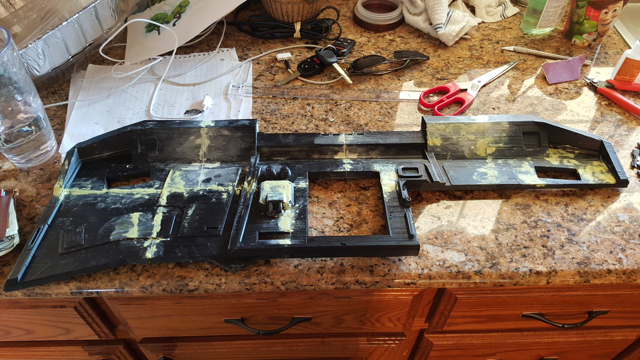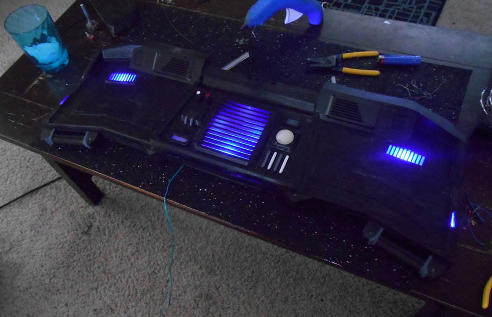 So, I finished the job and sent the console to my brother. It arrived last night and he was eager to get started with the electronics so he jumped right in. We are going to hook into the games sound system and log files to send the lighting commands to the various LEDs (he's using a PIC board he designed to control it). I had not had the chance to see it "lit up" in real life, but I saw in my head what it would look like with the LEDs. My brother did not disappoint me and I think it looks great. This is likely going to be the largest print I will ever do with the printer, requiring easily 200 hours of print time and countless hours modeling and researching the games layout of the console for this particular ship type.
