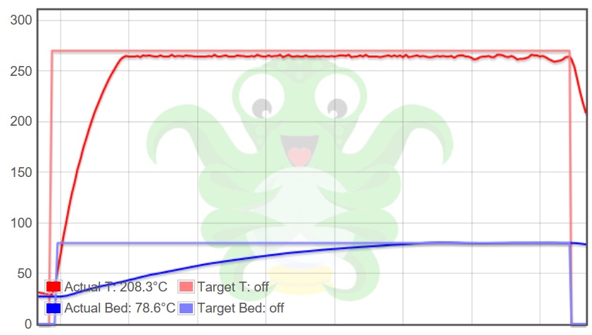 Currently doing a print at 270c/85c with the fans turned off to see what happens. It appears right now that the temp is still not a consistent line, but much closer to target than when the fans are running and I can likely get a print out that at least finishes. At looking at the print, I will need to turn the fans on some and/or lower the extruder temp a bit.