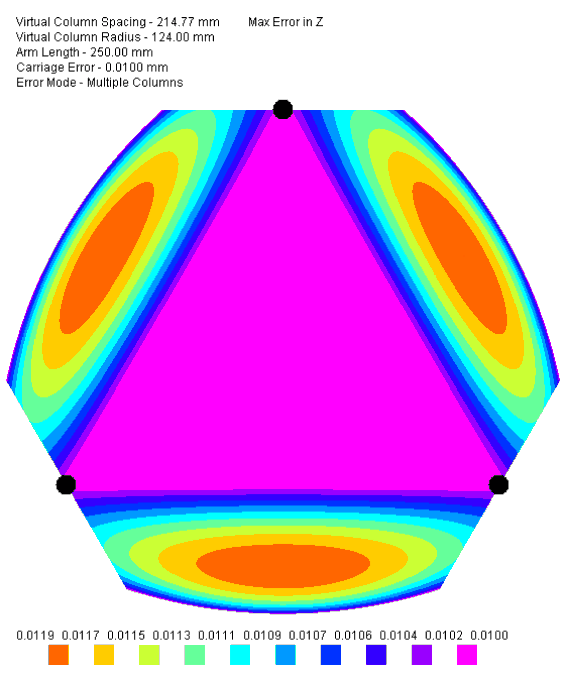 My reading of that piece what's the error I that diagram isn't from simulated slop, it's from the fact that steppers have fixed resolution and as the arms move away from the towers basically Z accuracy suffers, by a small ammount, what's misleading is the big flat area in the middle wiphich is also curved, but the author is truncating to 4 decimal places.