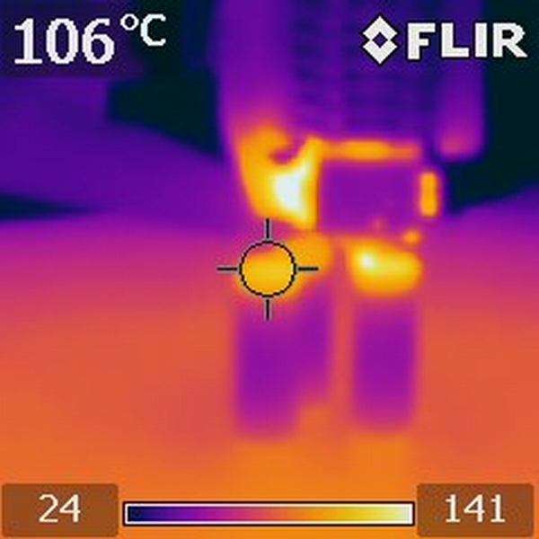 And just cause - IR picture of the hot end printing. I wanted to make sure the heat break was staying cool and it also let me see the heat across the bed. Just too bad the pictures aren't the greatest quality and the logo and crosshair takes up so much space.