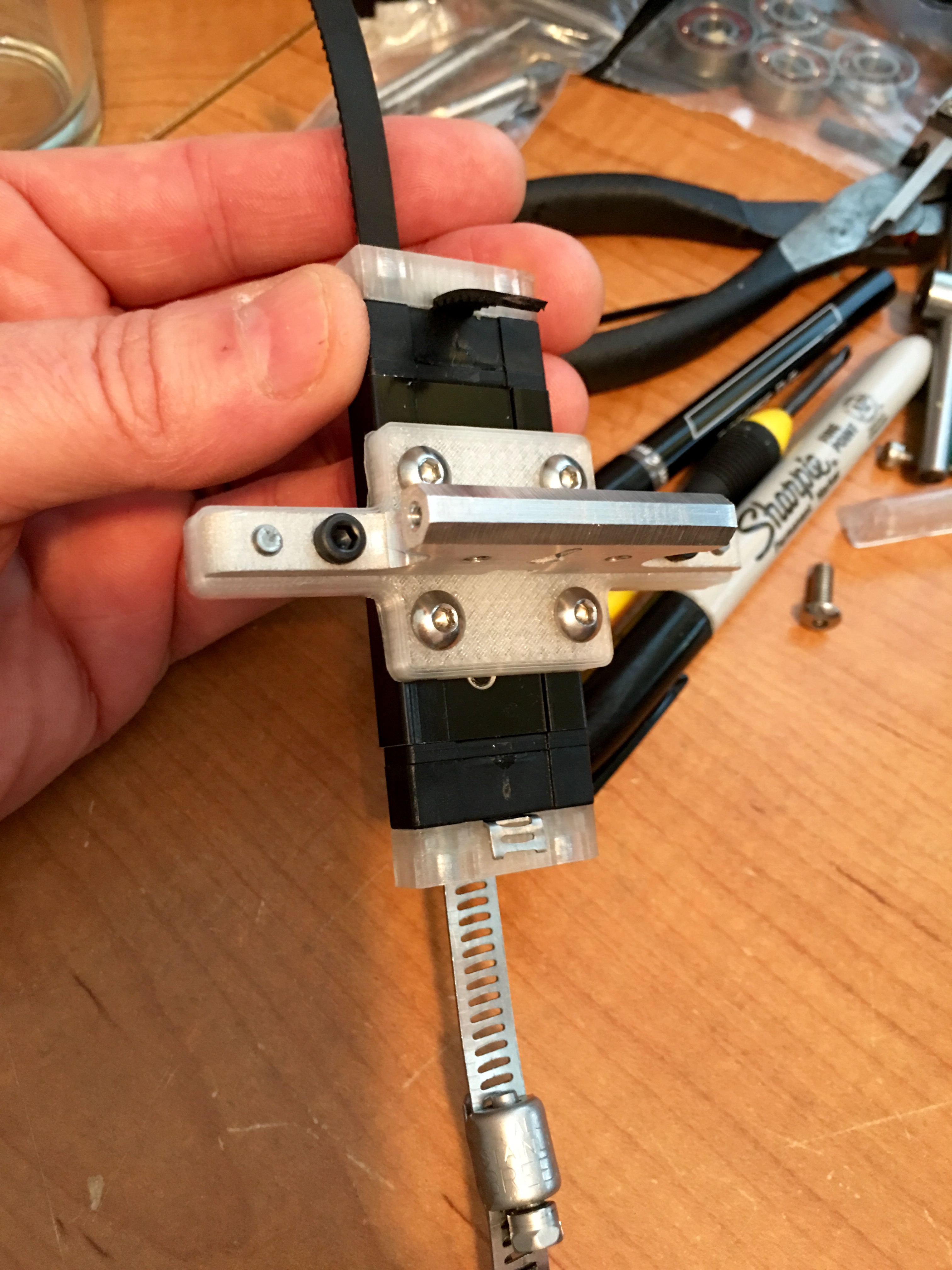 4) I "open" the hose clamp so you have a 4" long x 1/4" wide slotted strip with the adjustment screw in the middle. One end off this attaches to the bottom of the carriage as shown in the photo above. The other end is attached to the belt. I am making a little clamp that the belt inserts into and folds over for security.