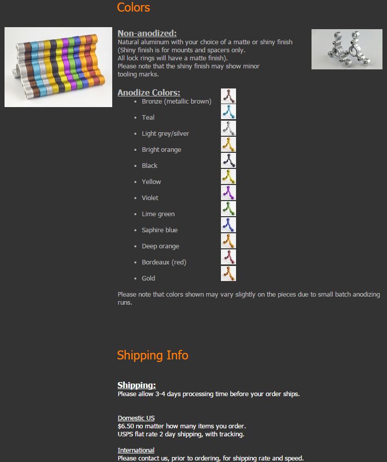 Just dropping by to say the response has been amazing guys! The mills are running around the clock and I think I am anodizing spacer end caps in my sleep I have done so many of them! But of course these are all great things! We have a big lot of orders going out tomorrow. We are cutting new stock as fast as we can and working on the third wave of orders now! So far Sapphire blue and black are the most popular colors by far. Orange is in a close third. Four countries and counting and coast to coast in the USA already. I really hope everyone loves their mounts when they arrive!